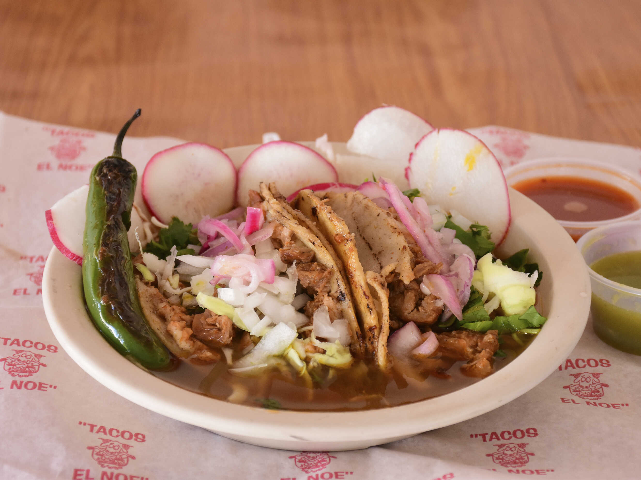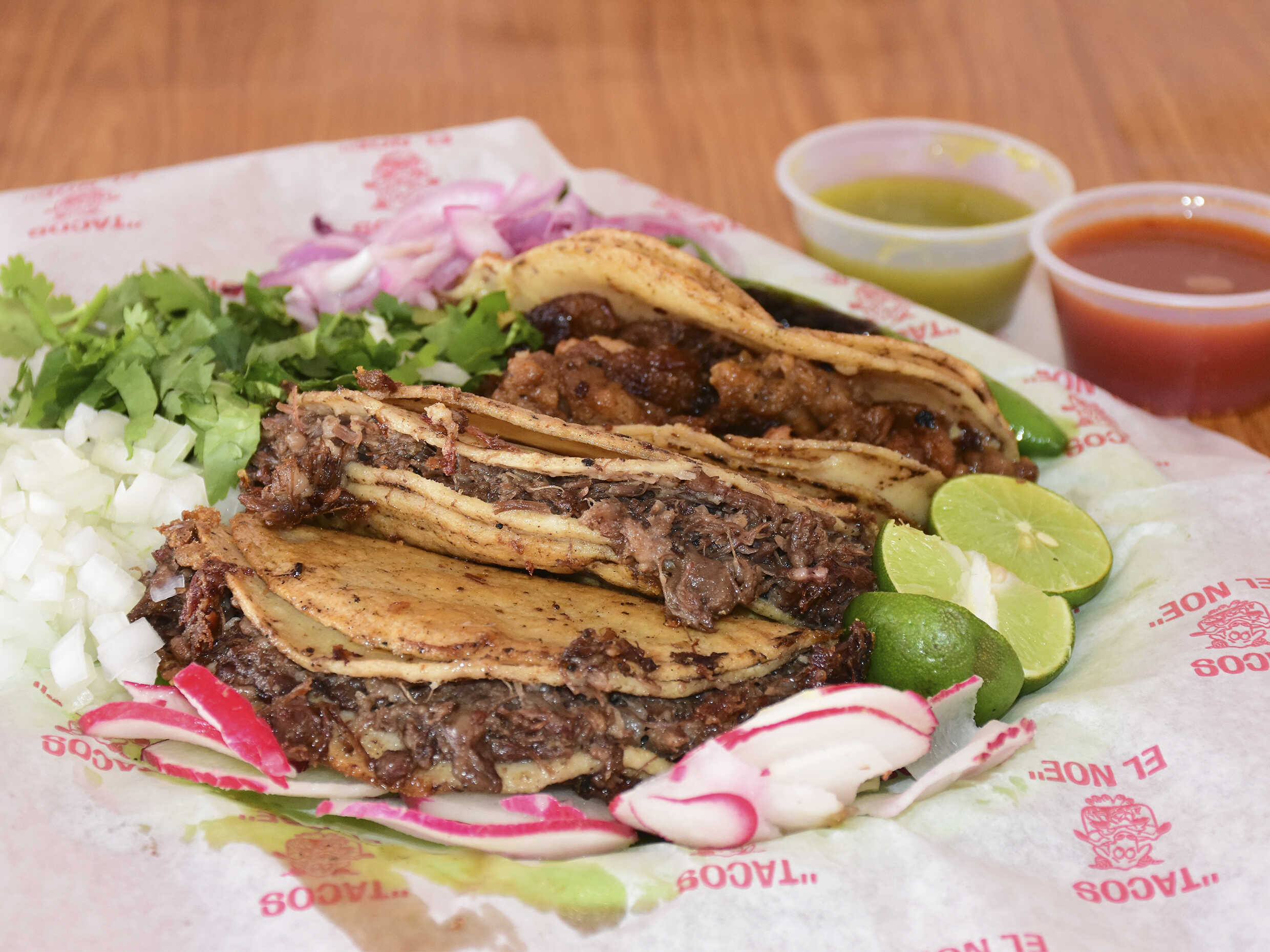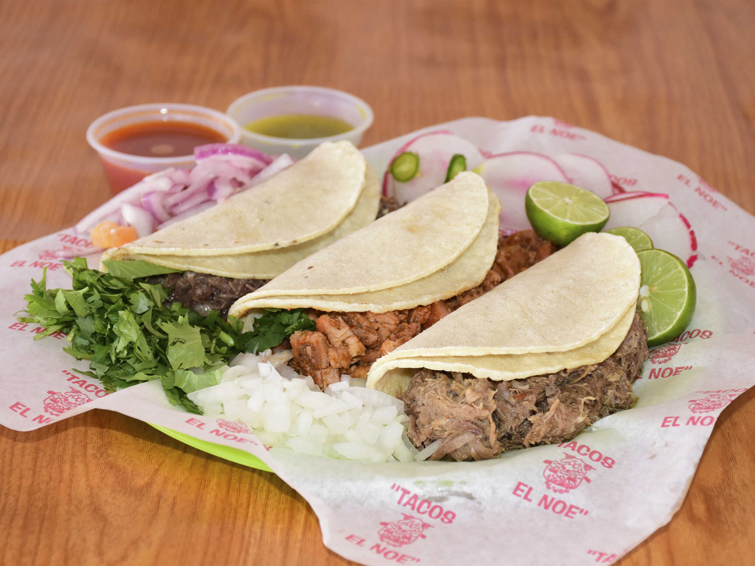 Cabeza, borrego, adobada, chicharrón y barbacoa de res, acompañada de verdura, salsa y limones.