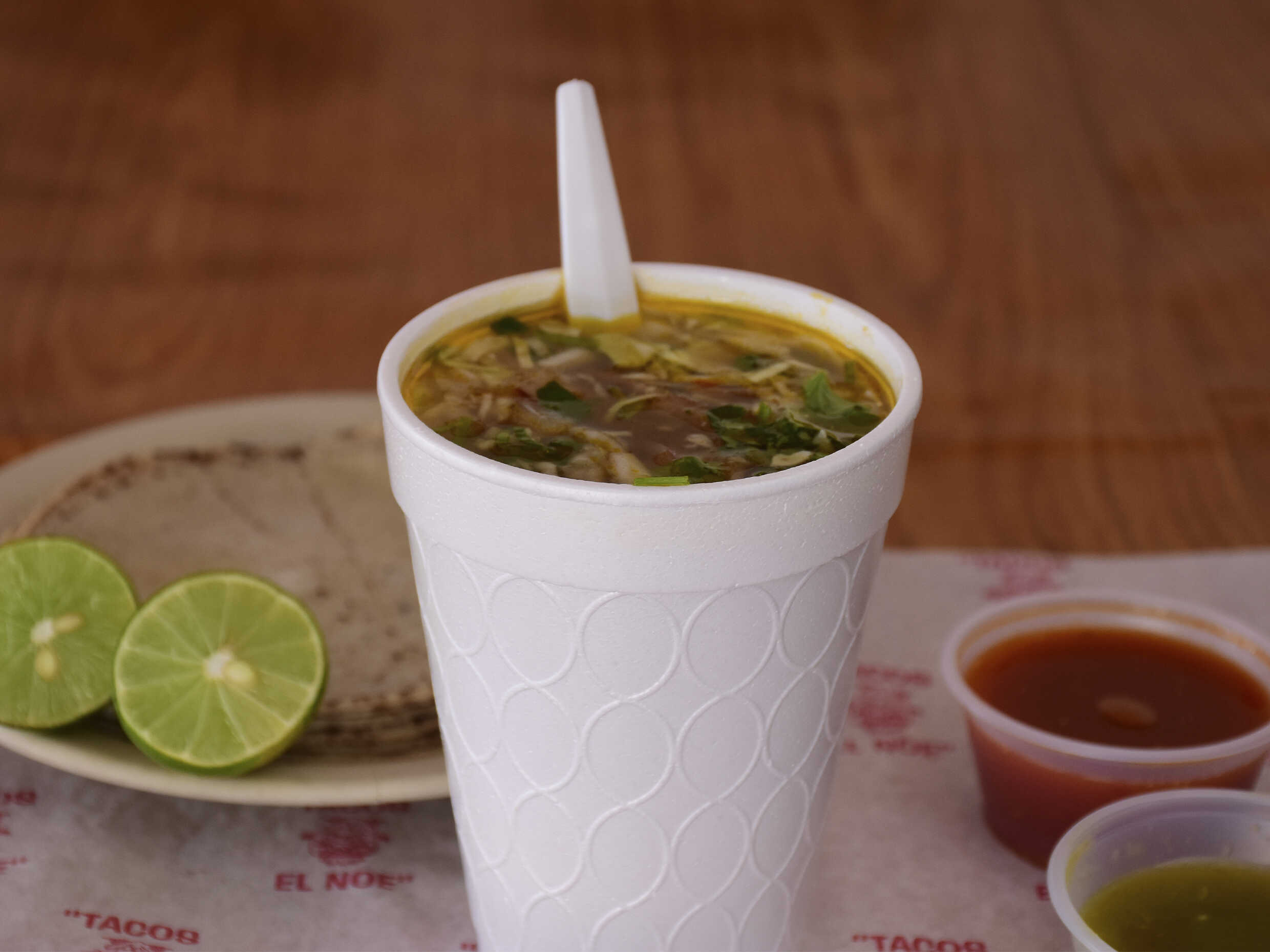 En vaso, cabeza o borrego y acompañada de verduras, tortillas, salsa y limones.