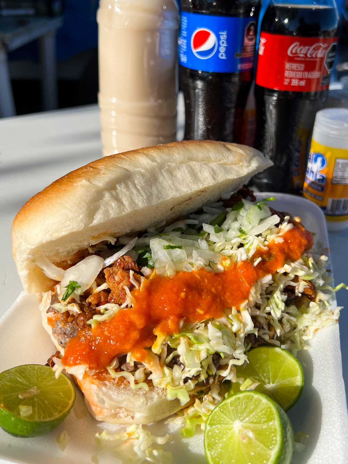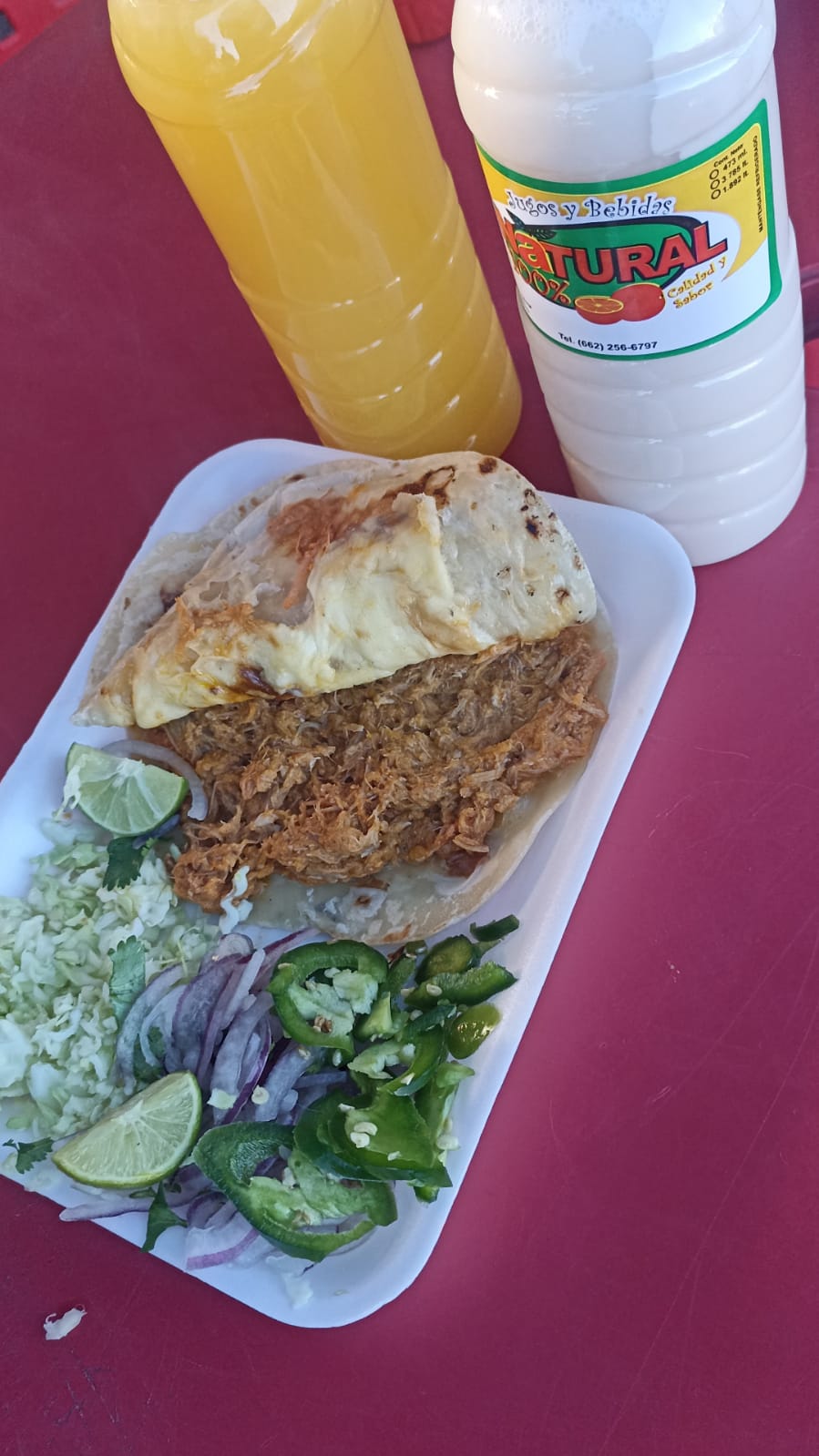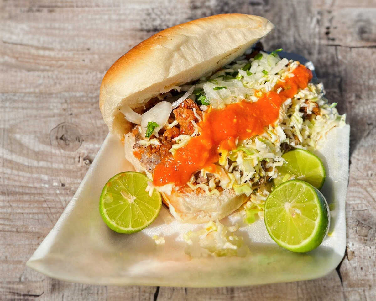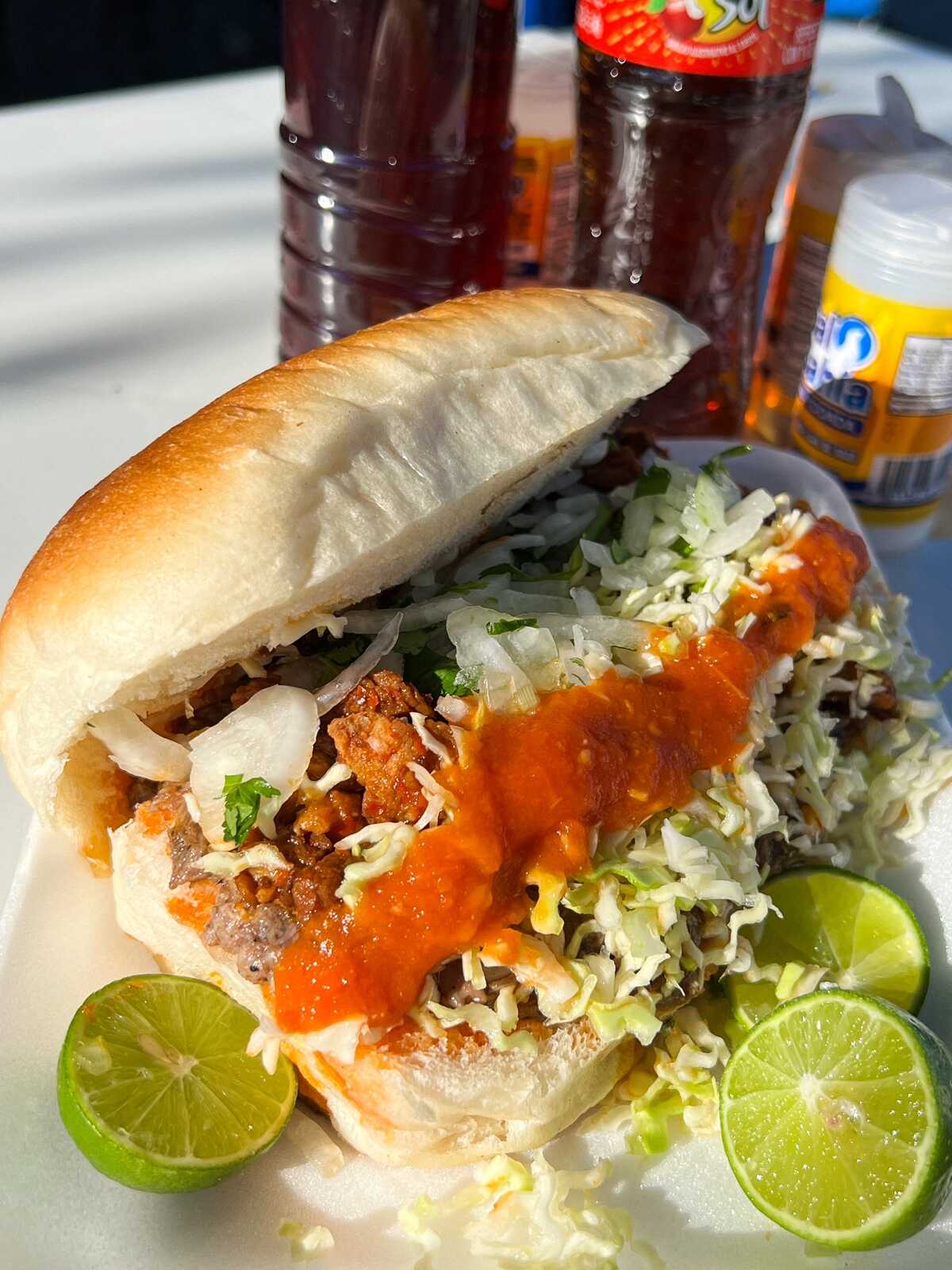 Torta grande de barbacoa Preparada con carne jugosa, verduras frescas, doble salsa y limón aparte.