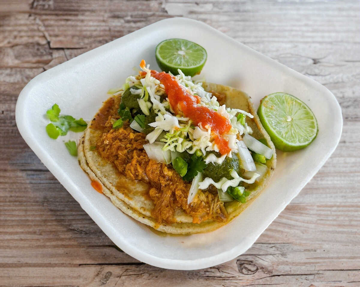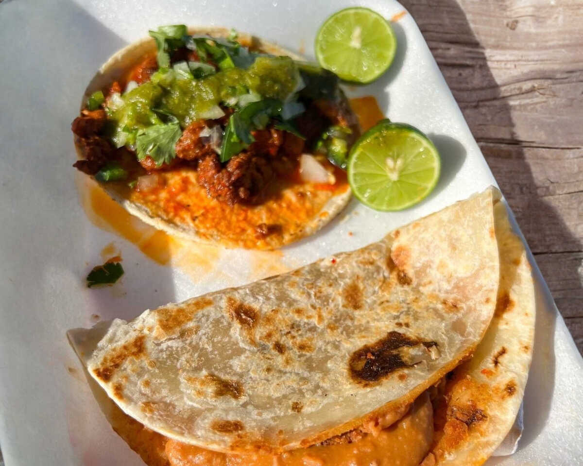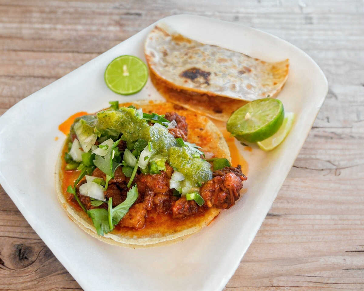 Taco de barbacoa estilo Obregón (Sonora) Carne de cerdo estilo Obregón estilo Sonora servida en tortilla de maíz, con verduras frescas aparte.