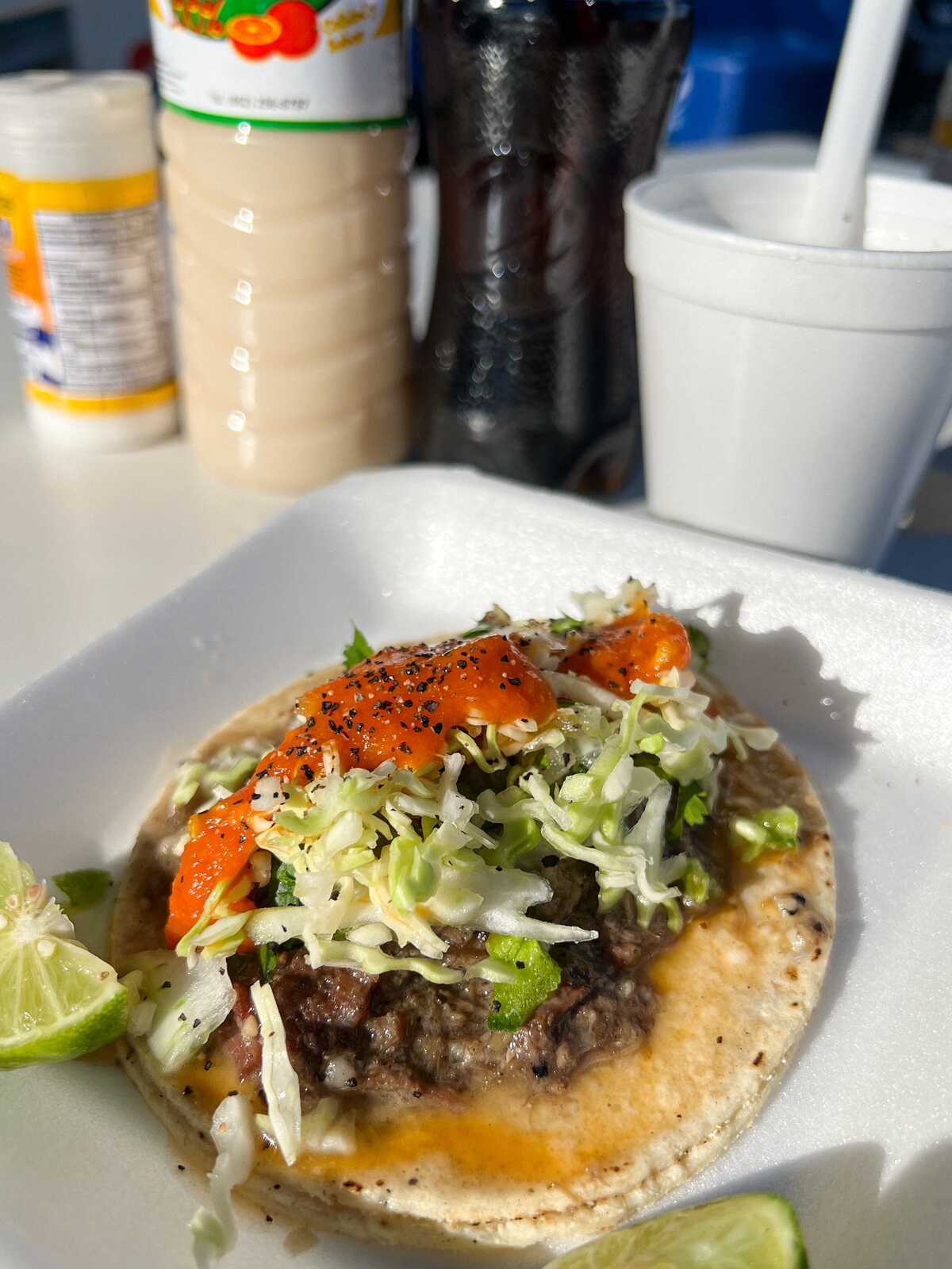 Taco de cabeza dos tortillas de maíz + carne, verdura, repollo + salsas rojas y verde
