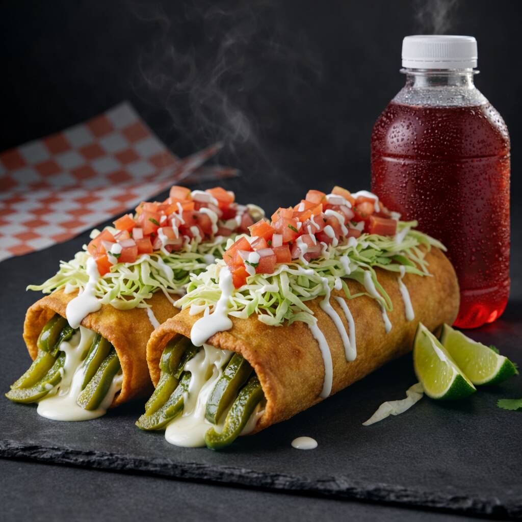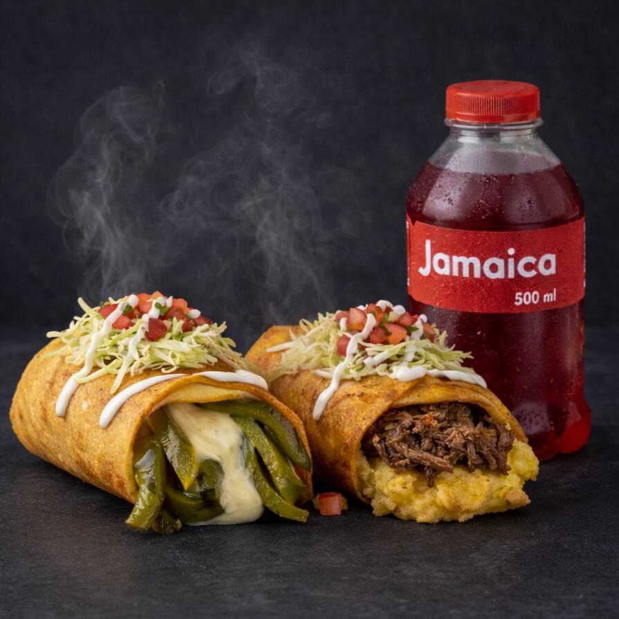 Dos deliciosas chimichangas crujientes de rajas con queso derretido, acompañadas de refrescante jamaica natural de 500 ml 😋. Preparadas al momento con sabor casero que te encantará.
