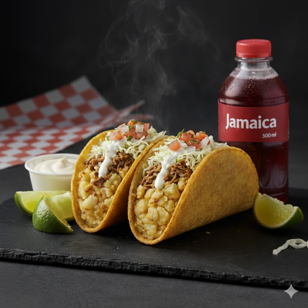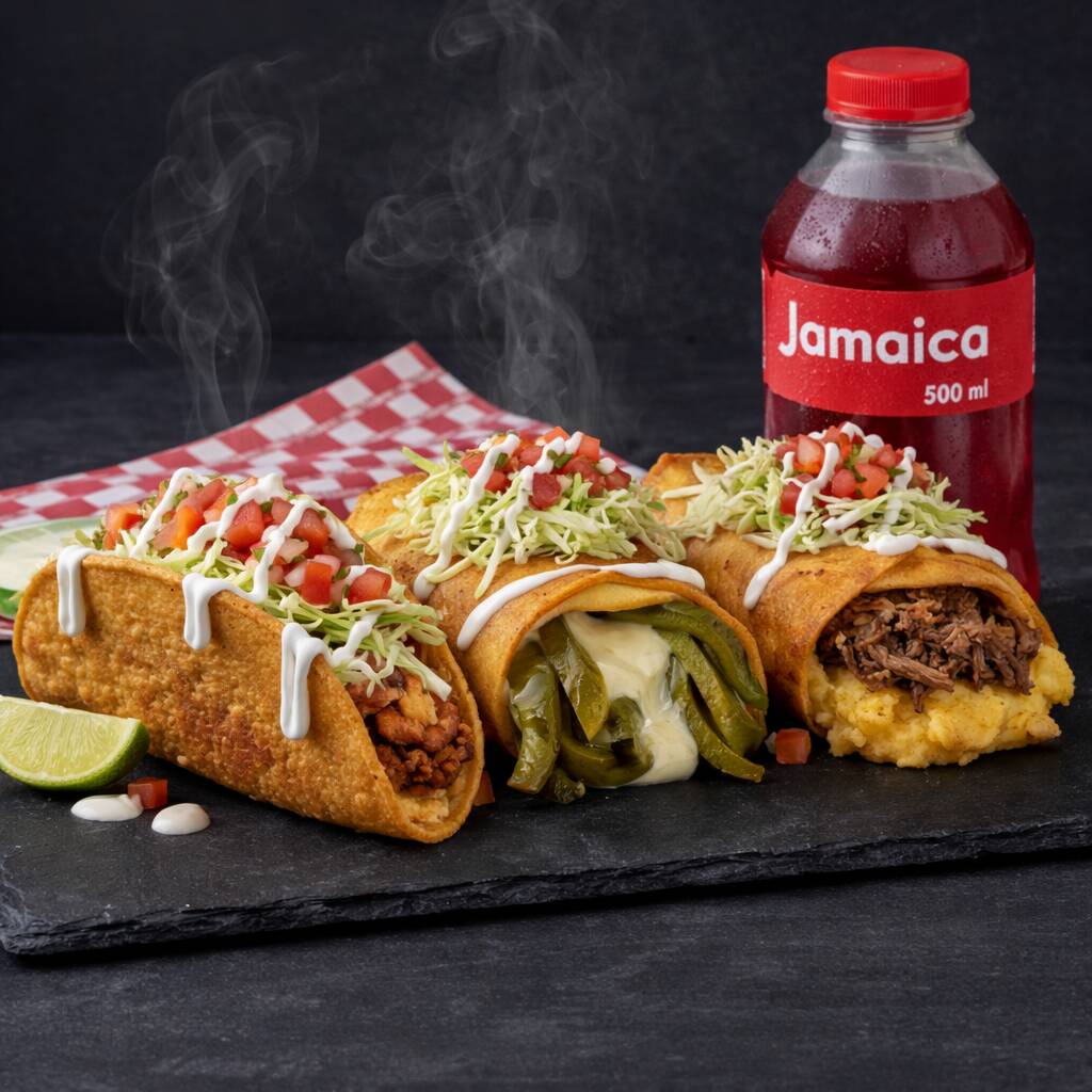 Dos crujientes tacos dorados recién hechos, acompañados de fresca jamaica natural de 500 ml 😋. Sabor casero, ingredientes frescos y el balance perfecto para disfrutar en cualquier momento.