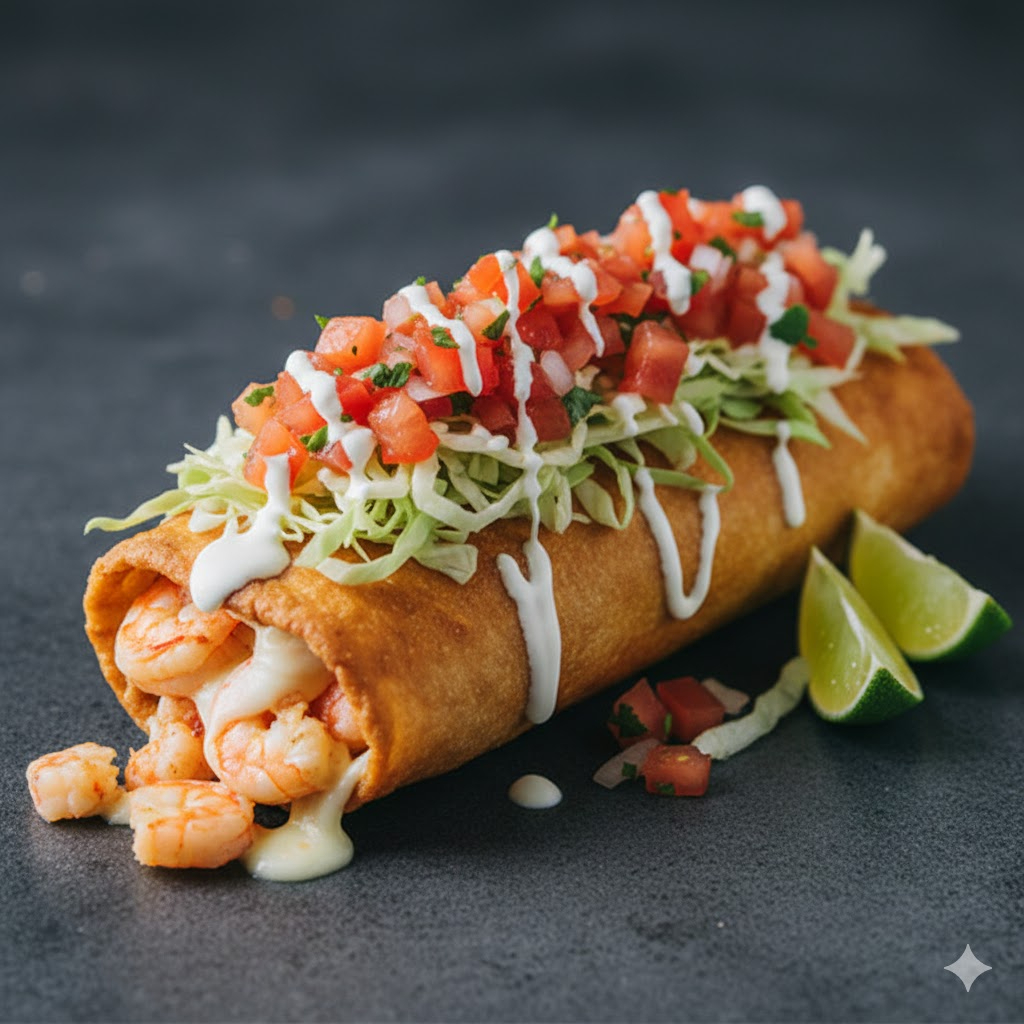 Chimichanga crujiente de camarón con queso derretido 😋, preparada al momento con ingredientes frescos y un delicioso sabor casero que te encantará.