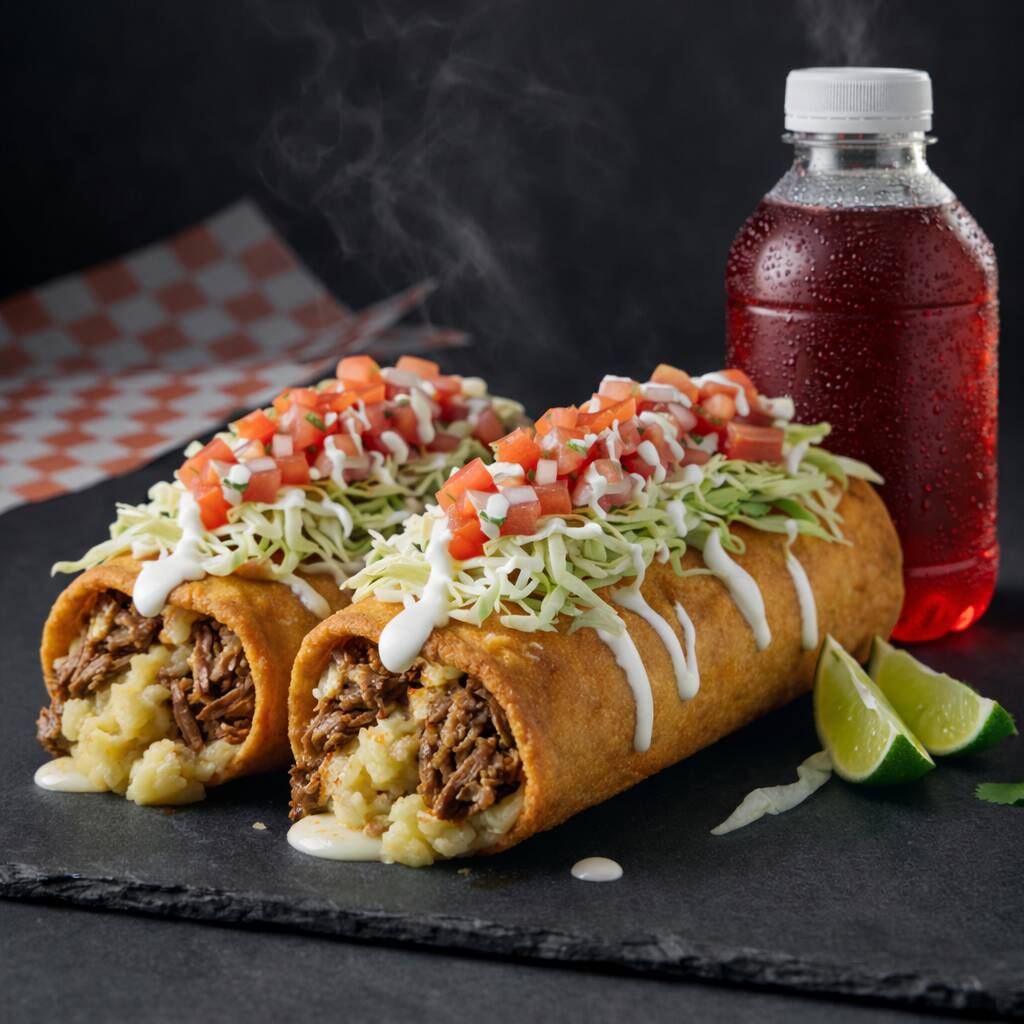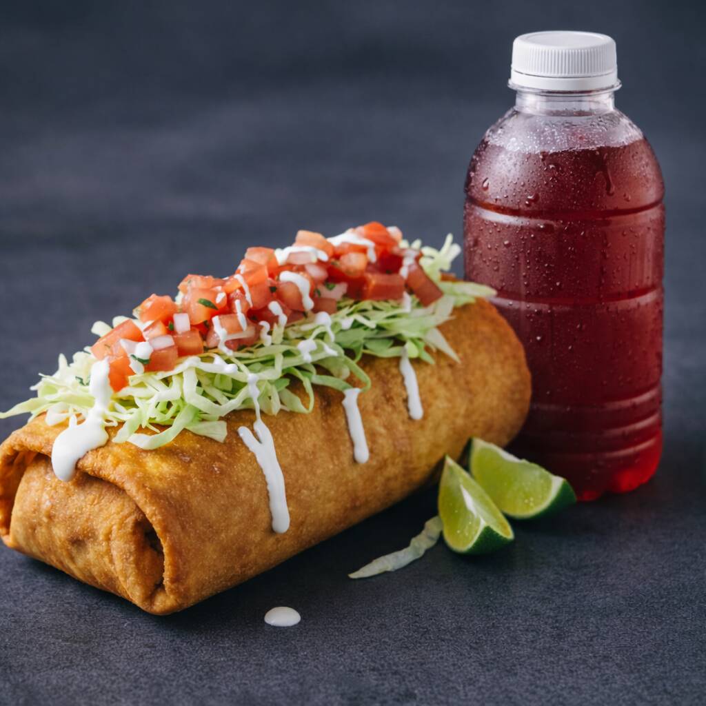 Dos chimichangas crujientes de carne deshebrada con papa, recién hechas y llenas de sabor casero 😋, acompañadas de refrescante jamaica natural de 500 ml. Perfecto para quitar el antojo.