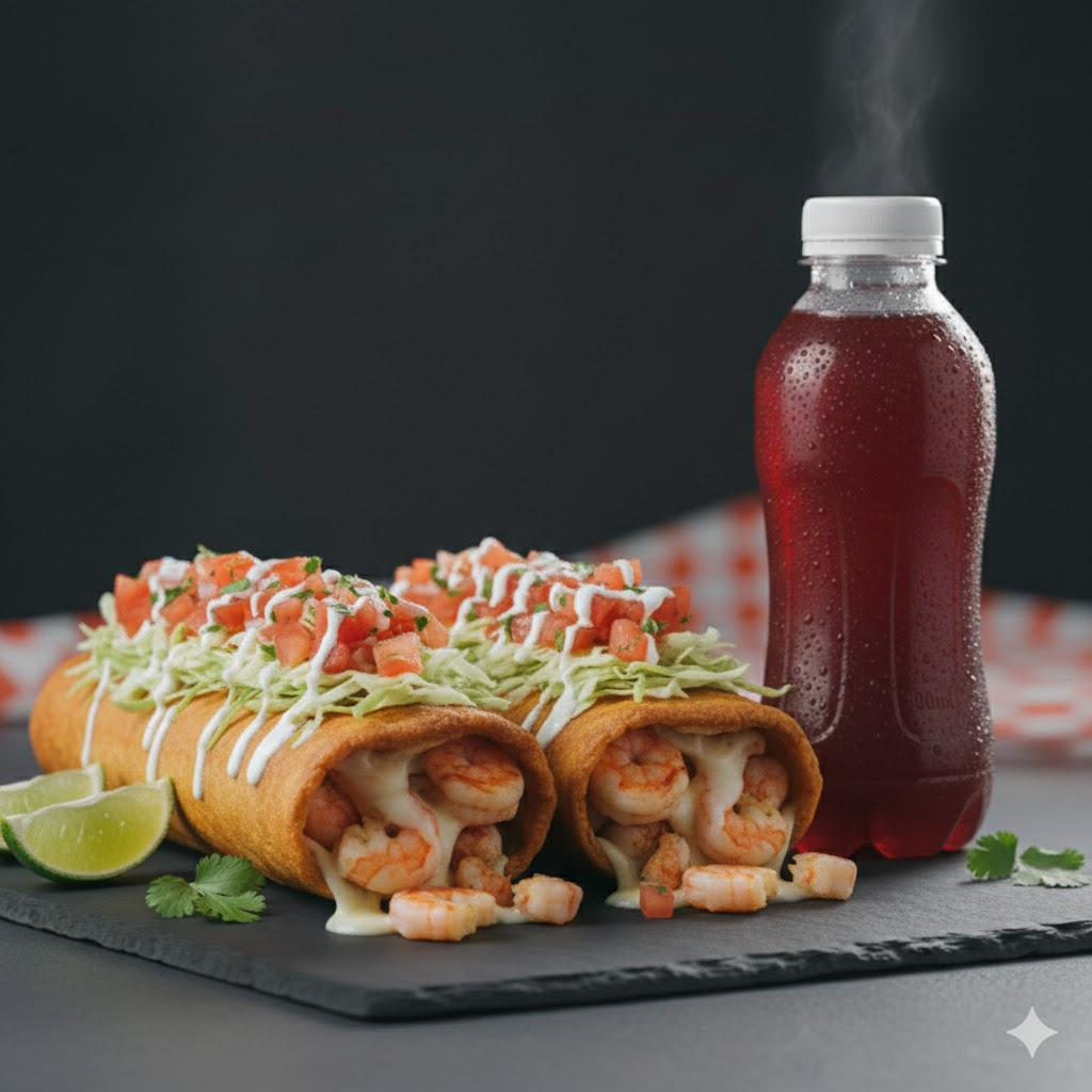 Dos deliciosas chimichangas crujientes de camarón con queso derretido 😋, preparadas al momento y acompañadas de refrescante jamaica natural de 500 ml. Sabor único y casero que te encantará.