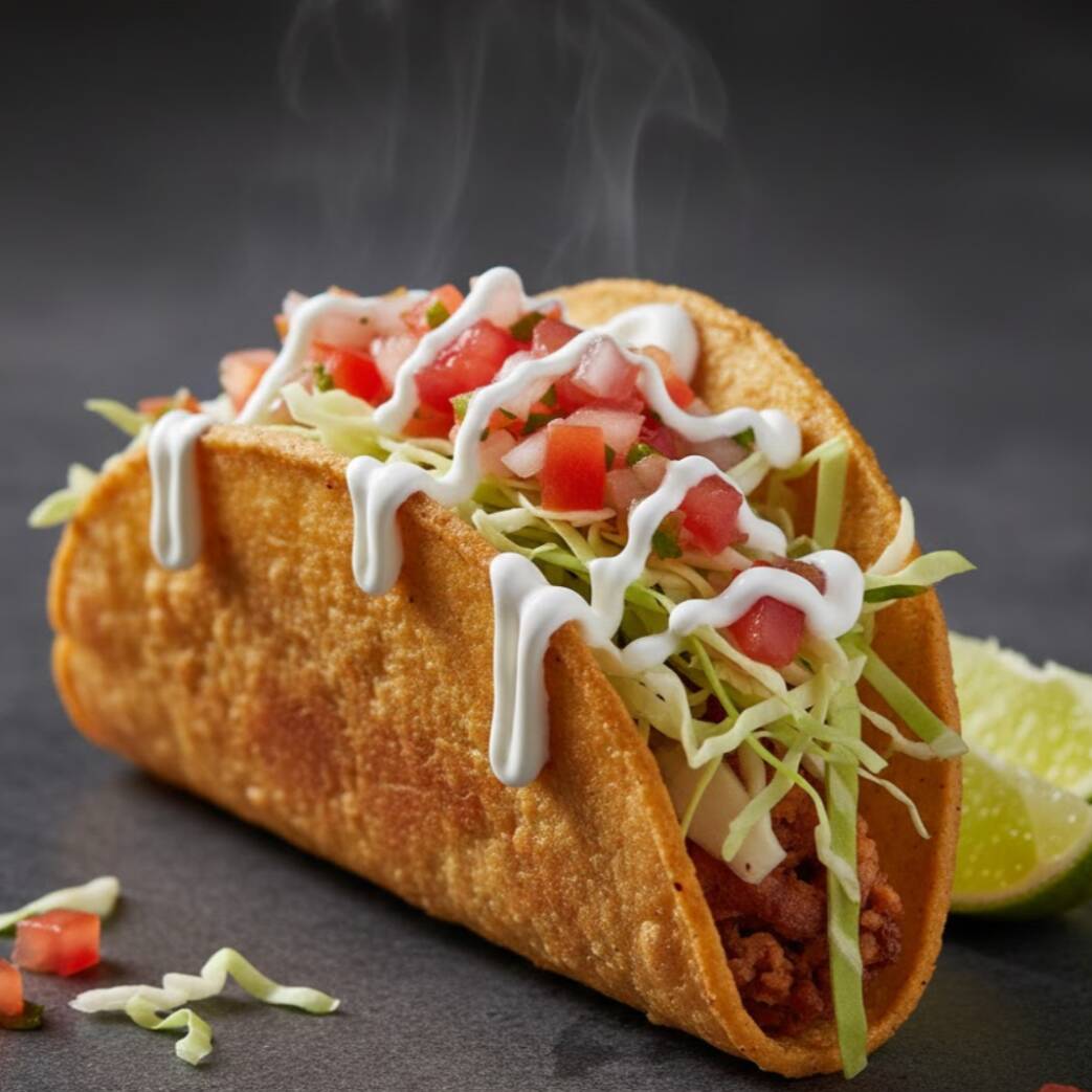 Taco dorado crujiente recién hecho 😋, relleno de carne con papa y acompañado de toppings frescos que le dan un delicioso sabor casero.