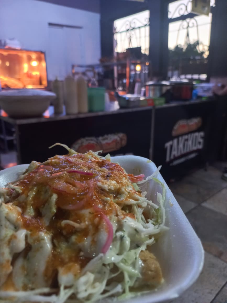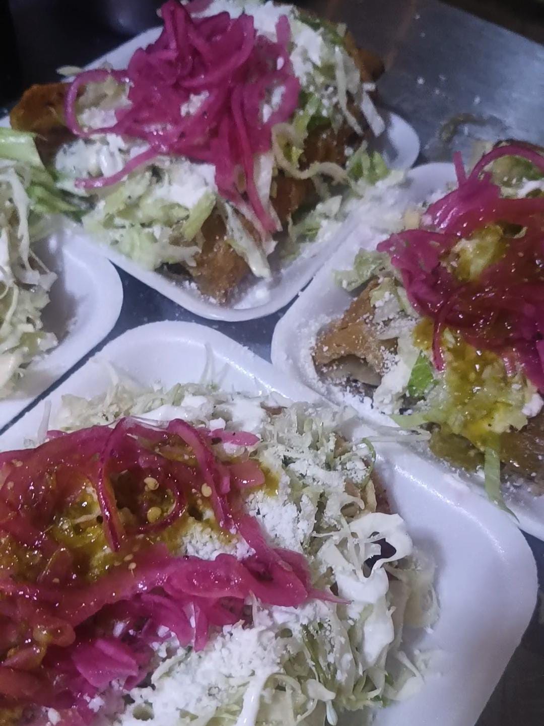 Orden de 6 tacos de nada (doraditos de papa). Los acompañamos con repollo, consomé de tomate sin picante y salsa verde picante. Aderezamos con crema natural, aderezo de cilantro, queso tipo cotija, cebolla morada curtida y limón.