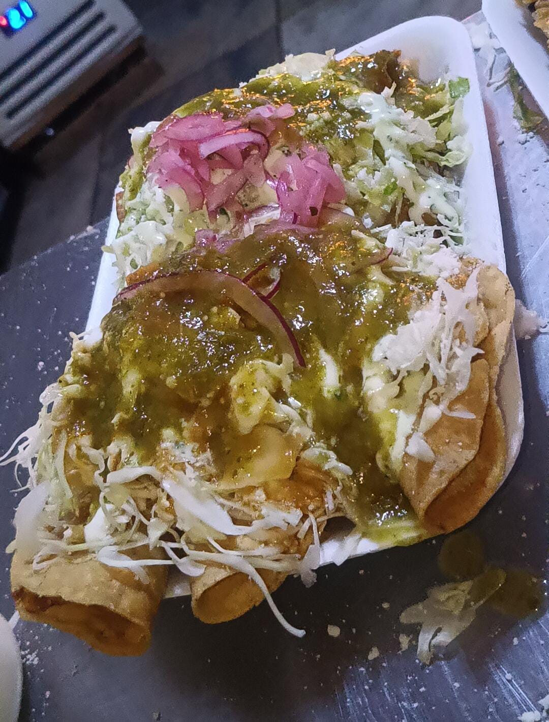 Platillo completo de 3 tacos dorados + Media chivichanga de papa con carne + Media chivichanga de frijoles refritos (las chivichangas son grandes). Las acompañamos con lechuga, repollo, consomé de tomate sin picante y salsa verde picante. Aderezamos con crema natural, aderezo de cilantro, queso tipo cotija, cebolla morada curtida y limón.