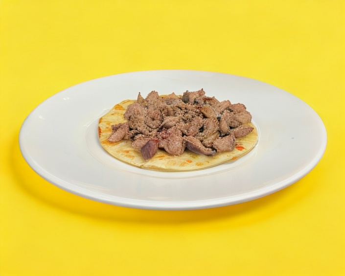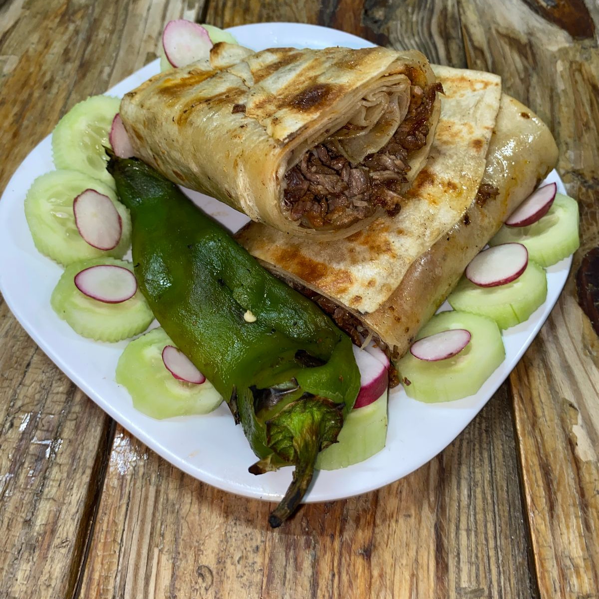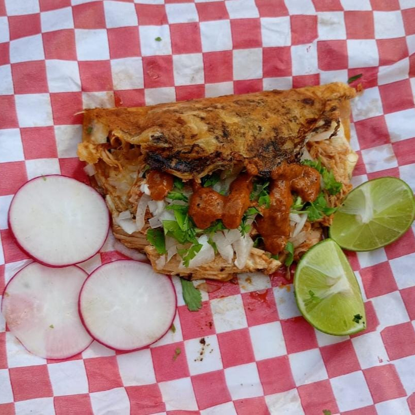 Deliciosa quesadilla doradita y recién hecha, rellena con carne jugosa y sazonada al gusto. Acompañada de salsa tradicional y verduras frescas,