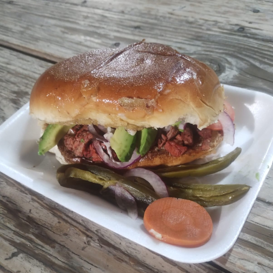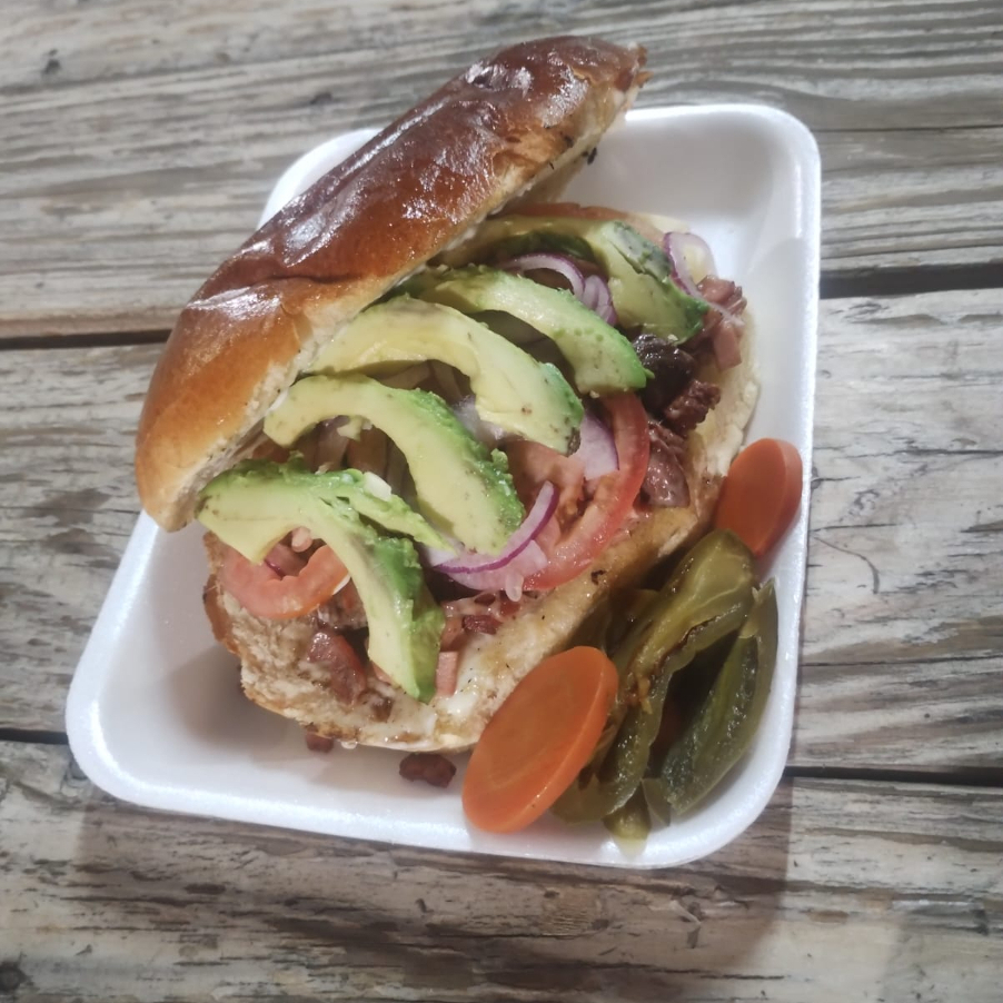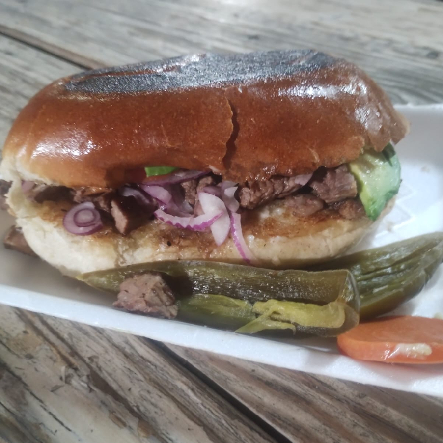 Torta especial de carne asada,adobada,bolonia,queso,tomate,aguacate,cebolla y chiles