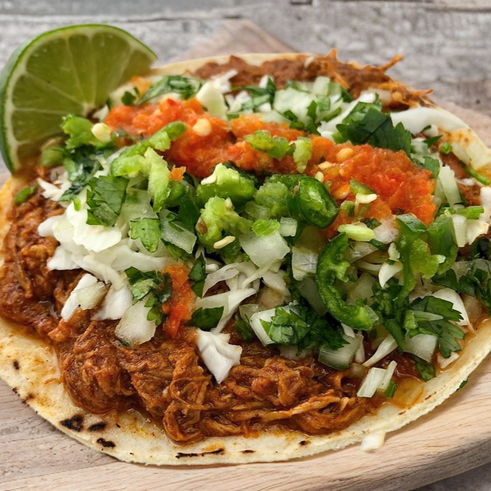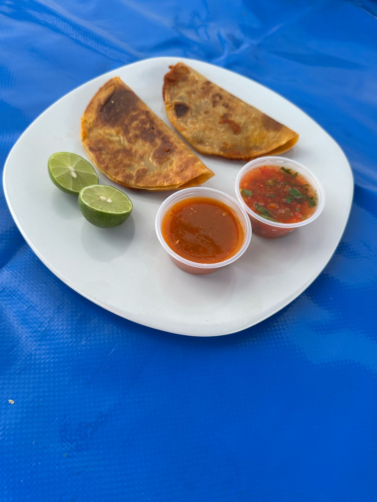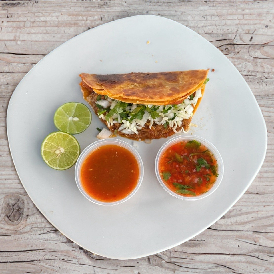 Hecha con dos tortillas de harina gorditas, con la carne de su elección; puede ser: cabeza, chicharrón o barbacoa