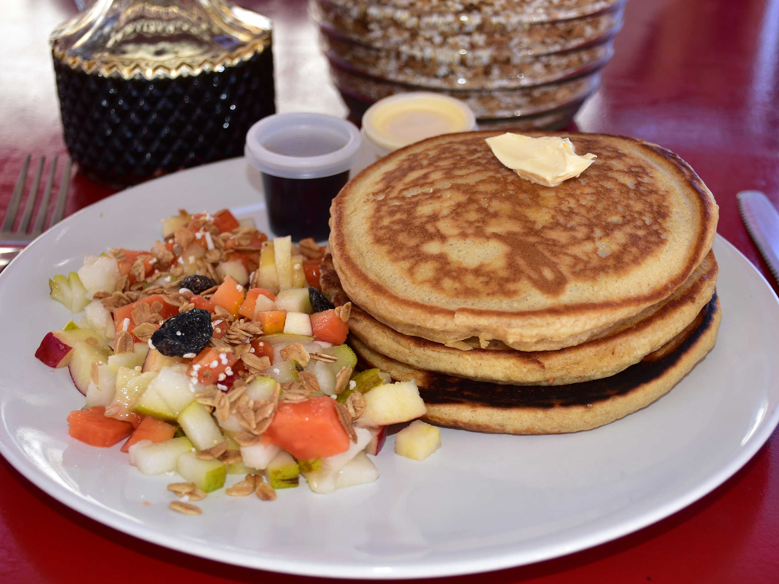 3 piezas de hot cakes acompañado de fruta de su elección, miel y mantequilla.