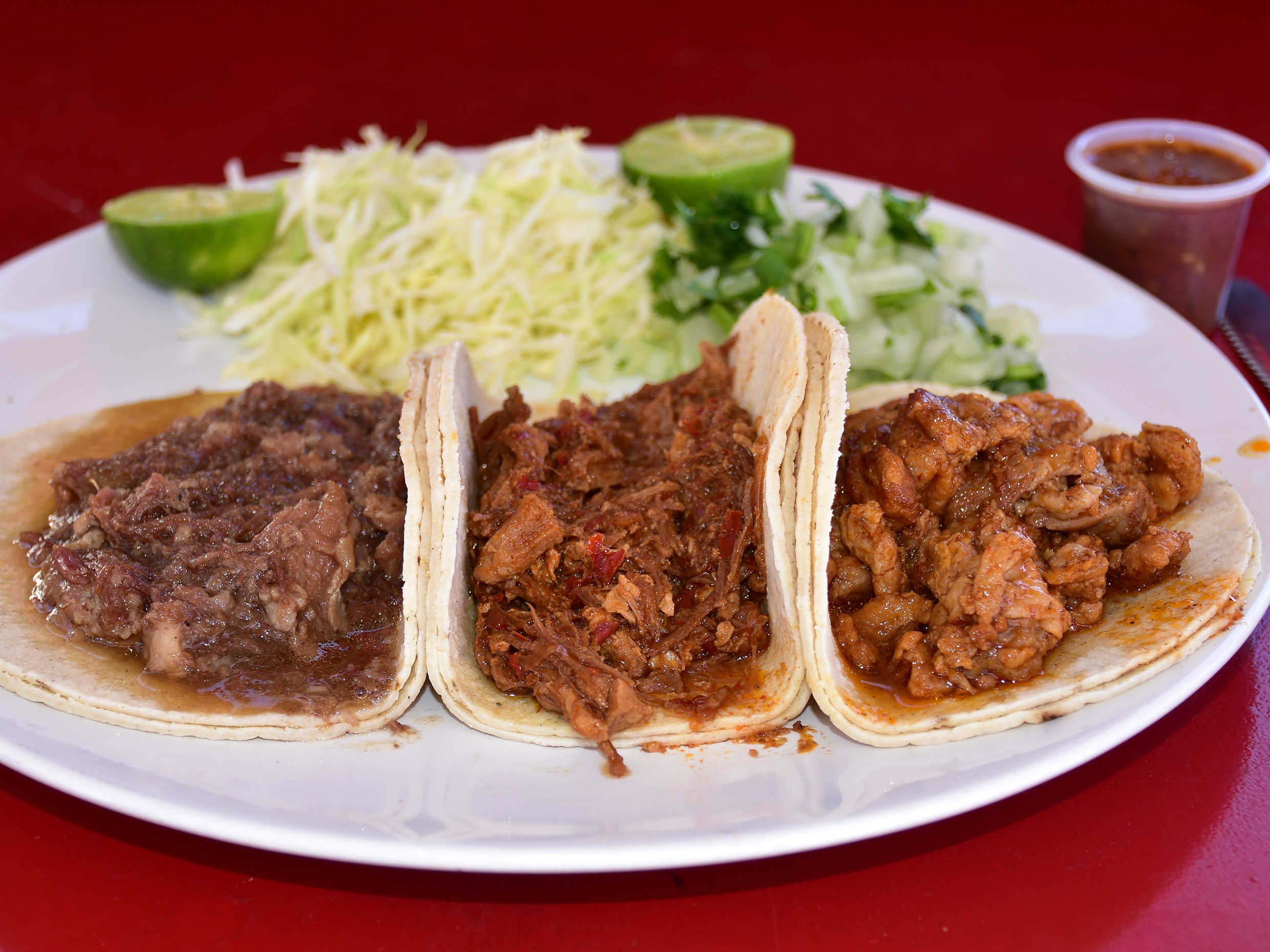 1 Taco con tortilla doble de maíz lleva carne de cabeza, barbacoa o chicharrón a eleccion, repollo, cebolla, cilantro, salsa y limón. (Porción personal)