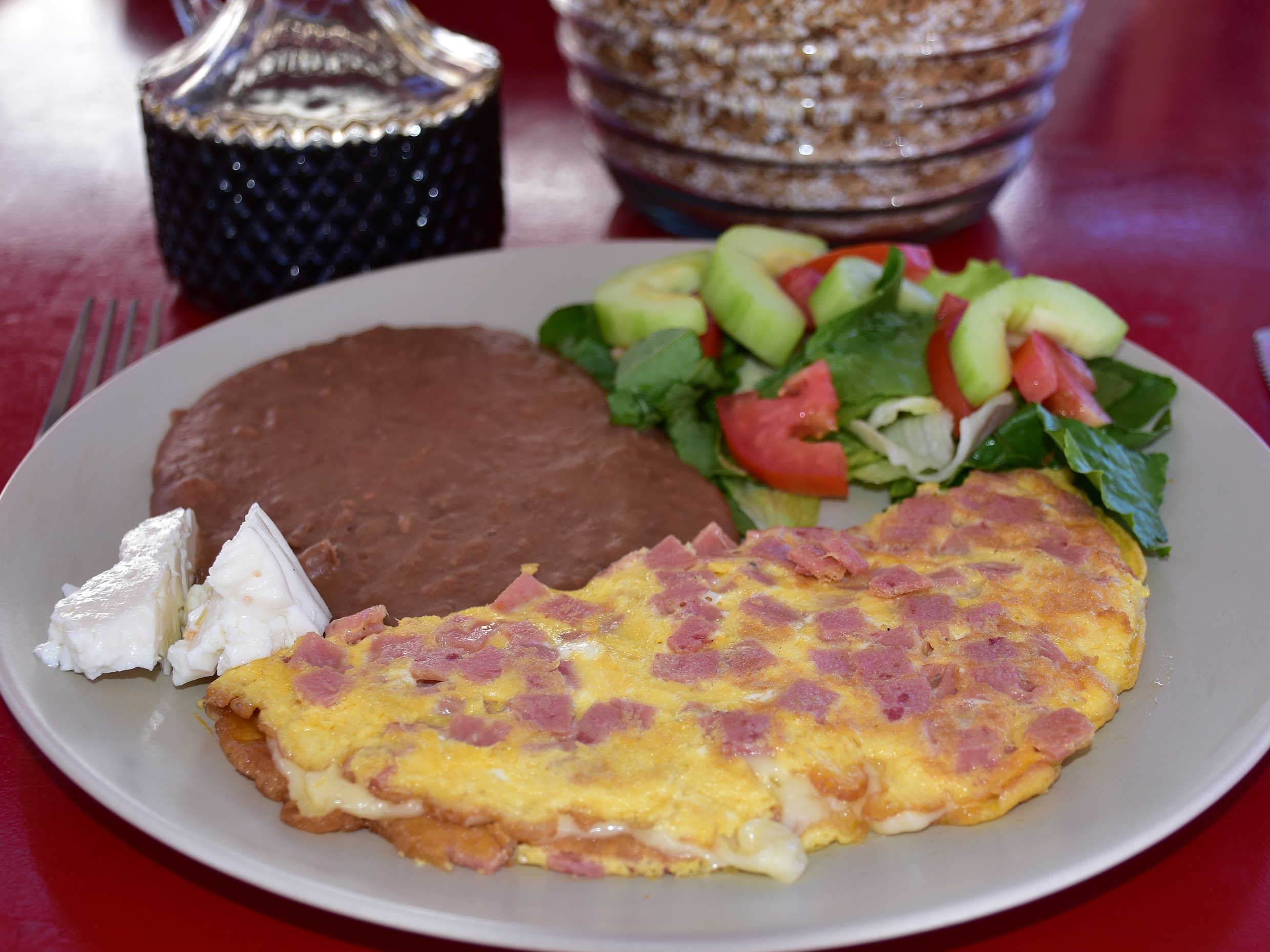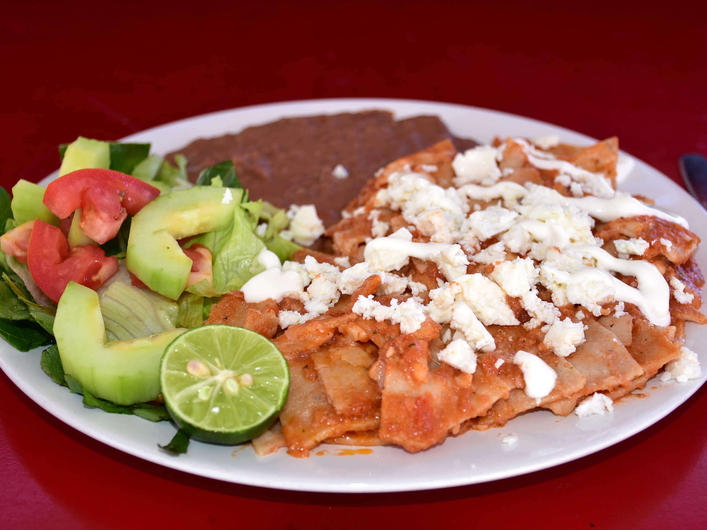 Chilaquiles rojos acompañado de ensalada, frijoles, queso, media crema y salsas.