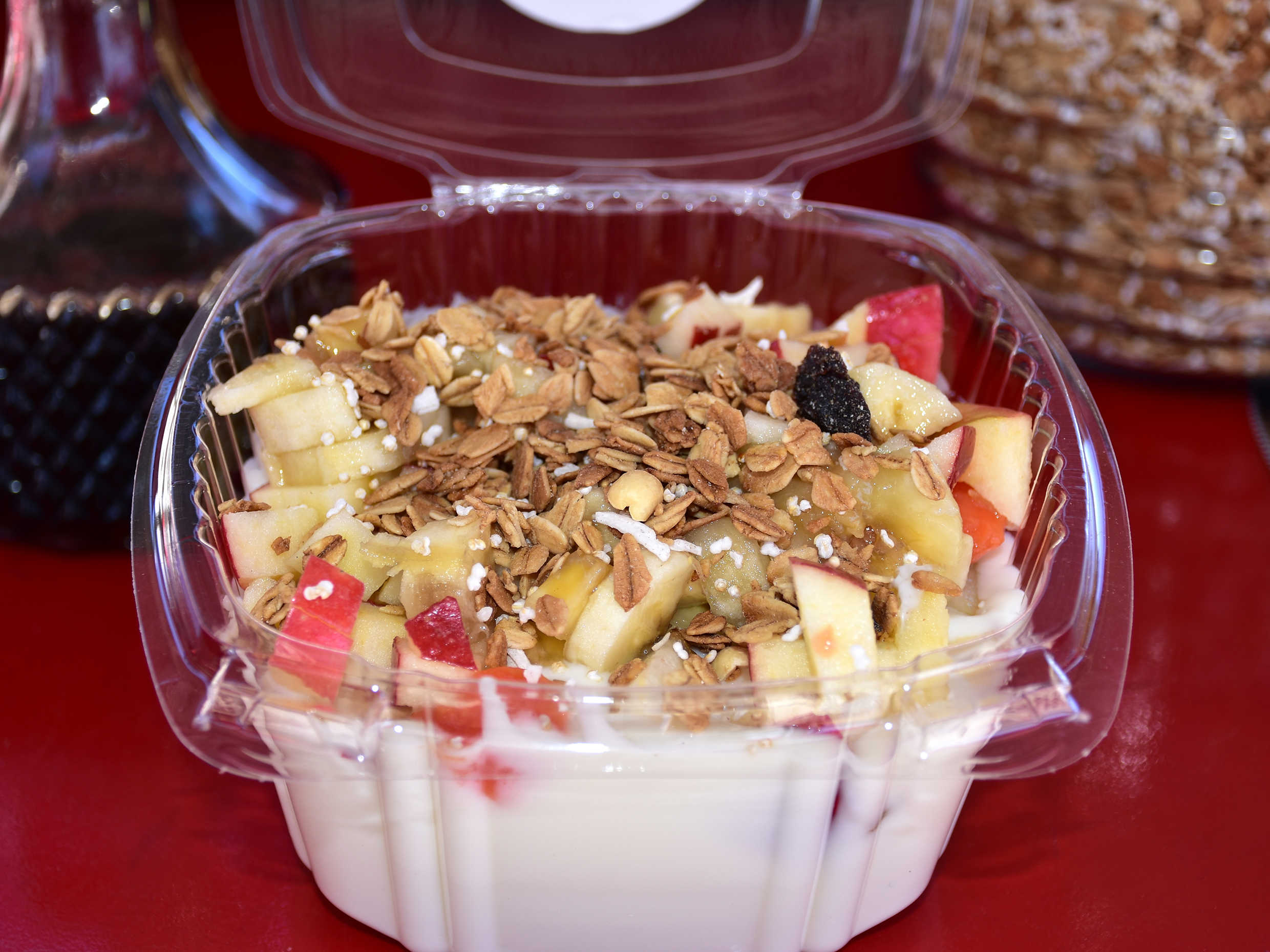 Yogurt con fruta, miel y granola.