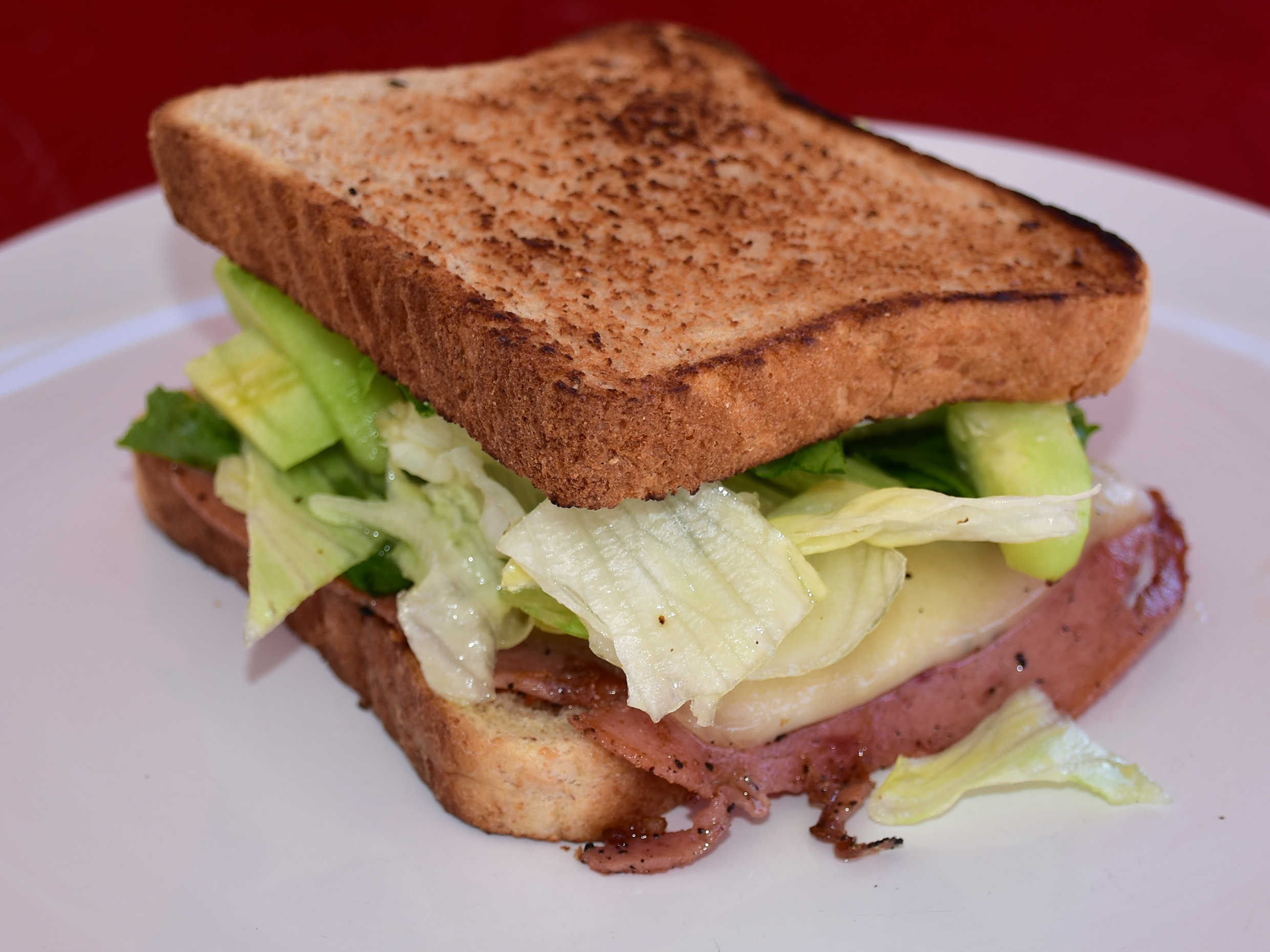 Pan integral dorado, lechuga, tomate, aguacate,queso y carne a su elección.