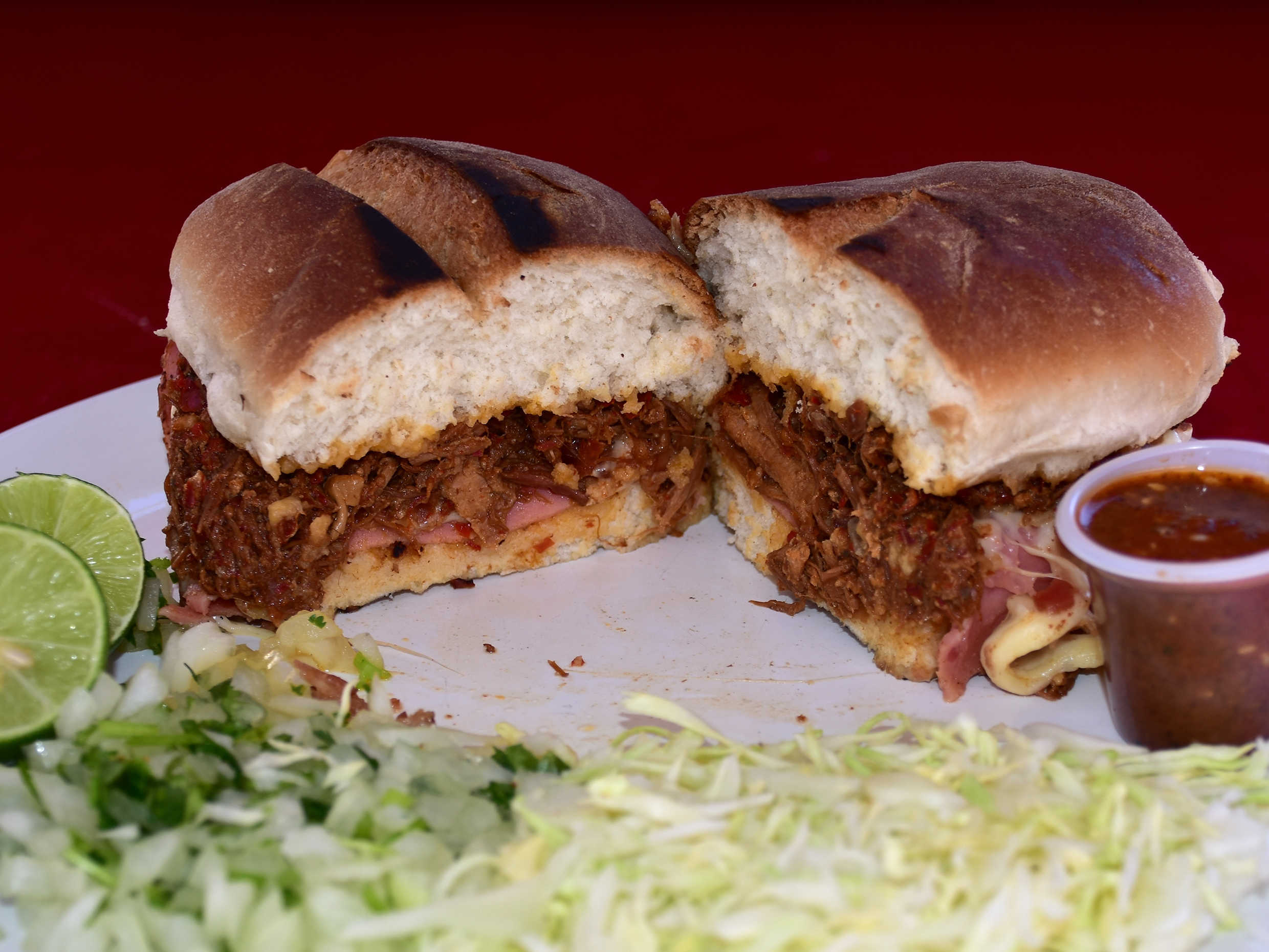 Torta con pan birote, jamón dorado, queso asadero, tocino y carne a elegir.
