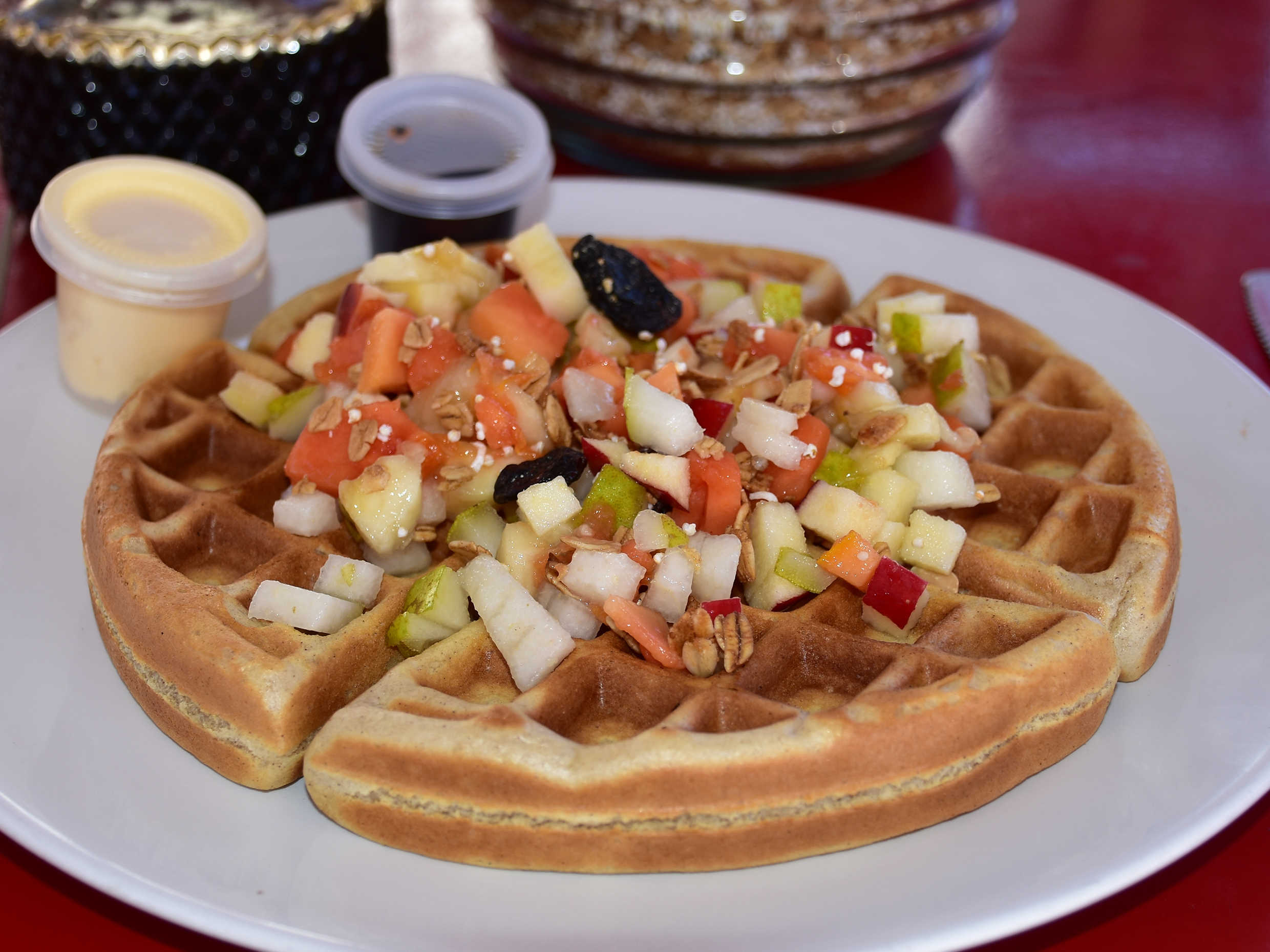 4 piezas (triángulos) de waffles acompañado de fruta de su elección, granola, miel y mantequilla.