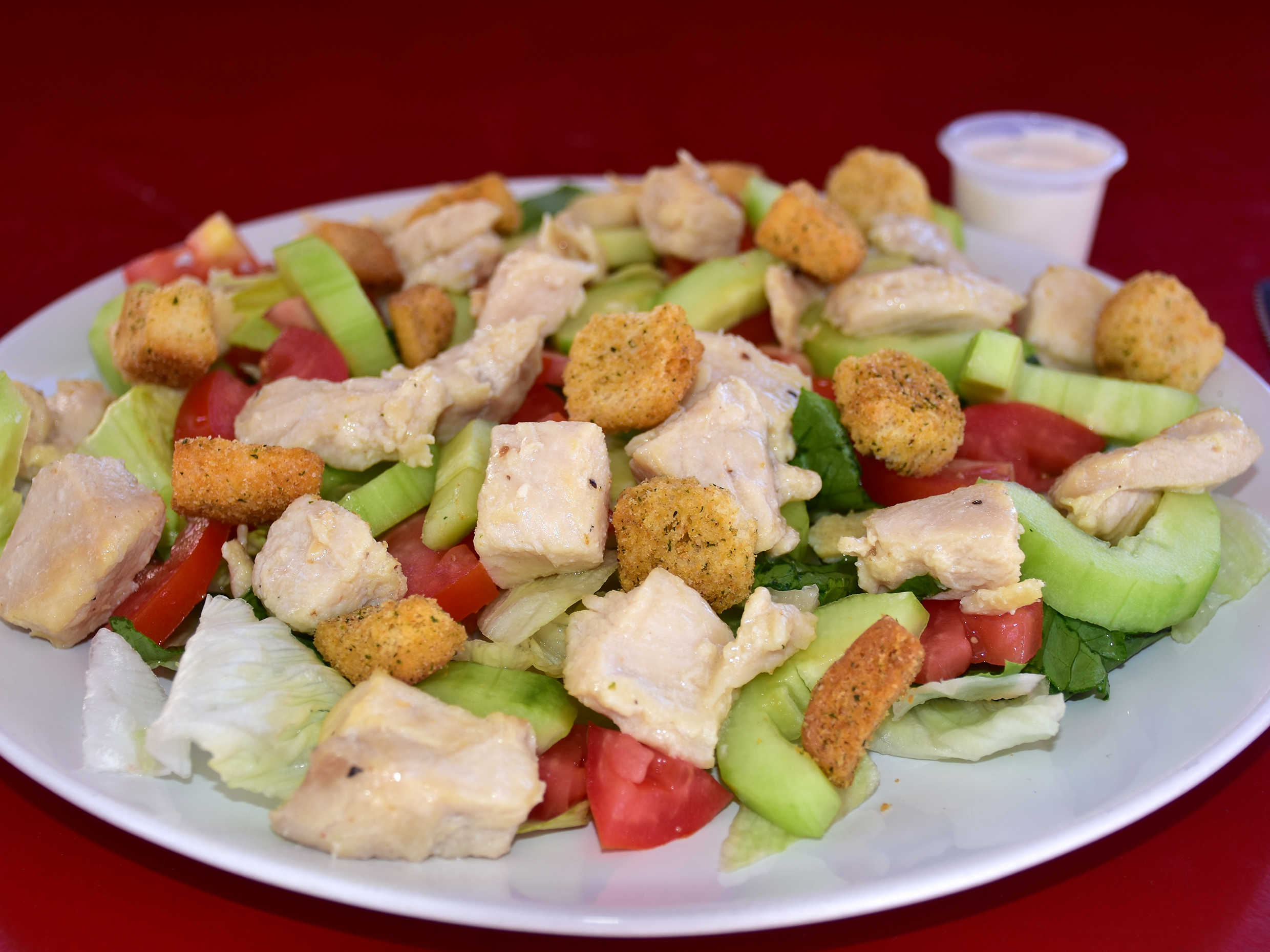 Base de lechuga, tomate, pepino, aguacate, cortines, aderezo y proteína de tu elección.