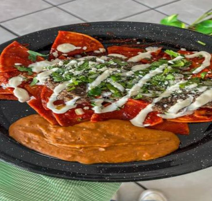 Chilaquiles con salsa de su preferencia, carne de su elección, cabeza, barbacoa, chicharrón, carne con chile, pierna al horno, cueritos.
