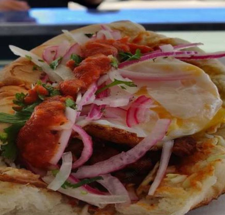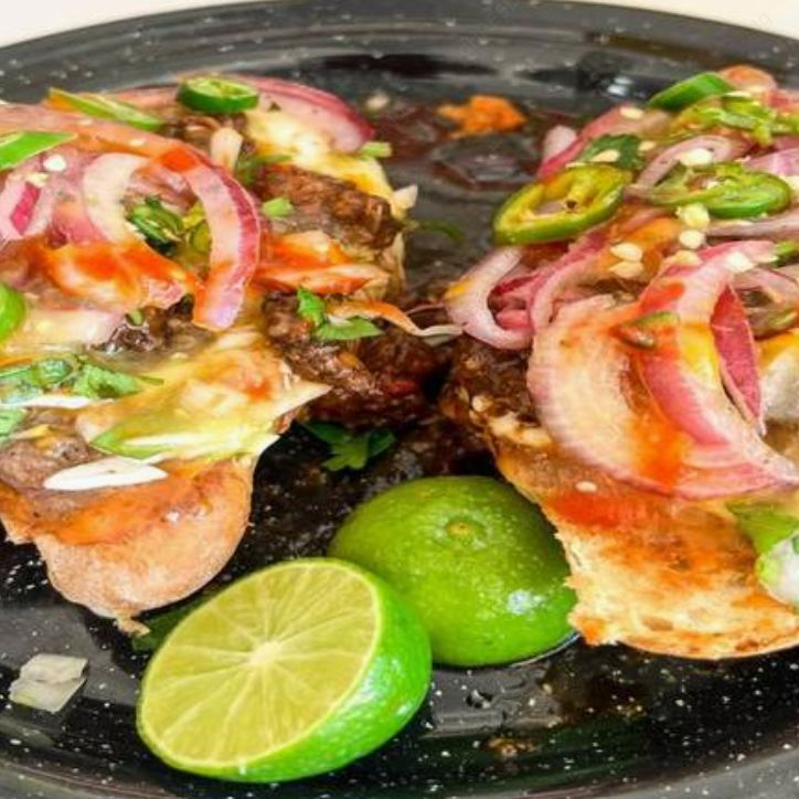 Pan birote del día hecho a la leña, dorado con mantequilla, frijoles maneados, queso gouda, acompañado con carne de tu elección.