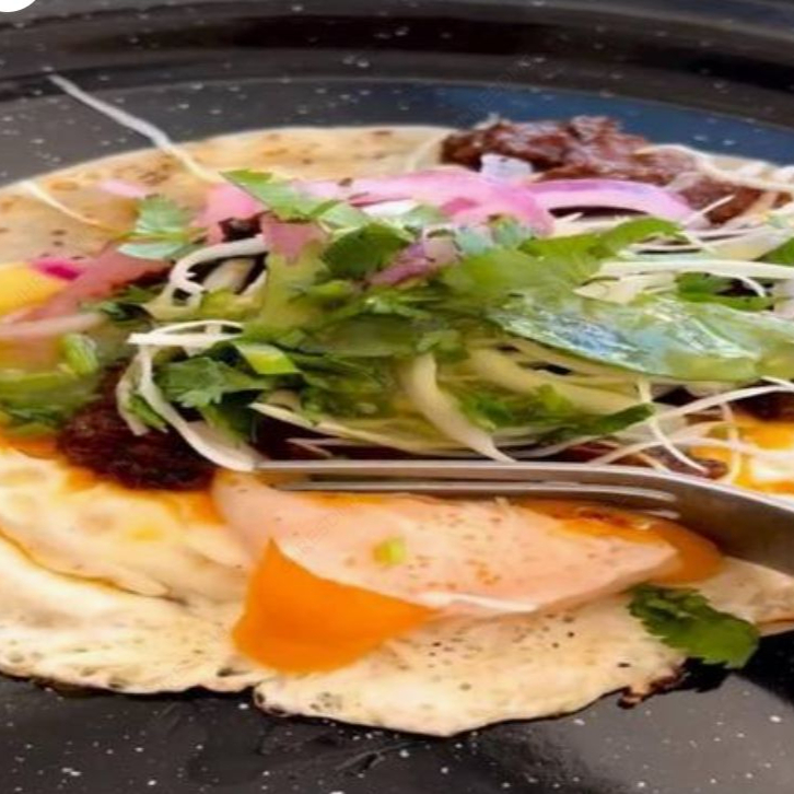 Tortilla de harina taquera, queso gouda, huevo estrellado o revuelto, carne de su elección.
