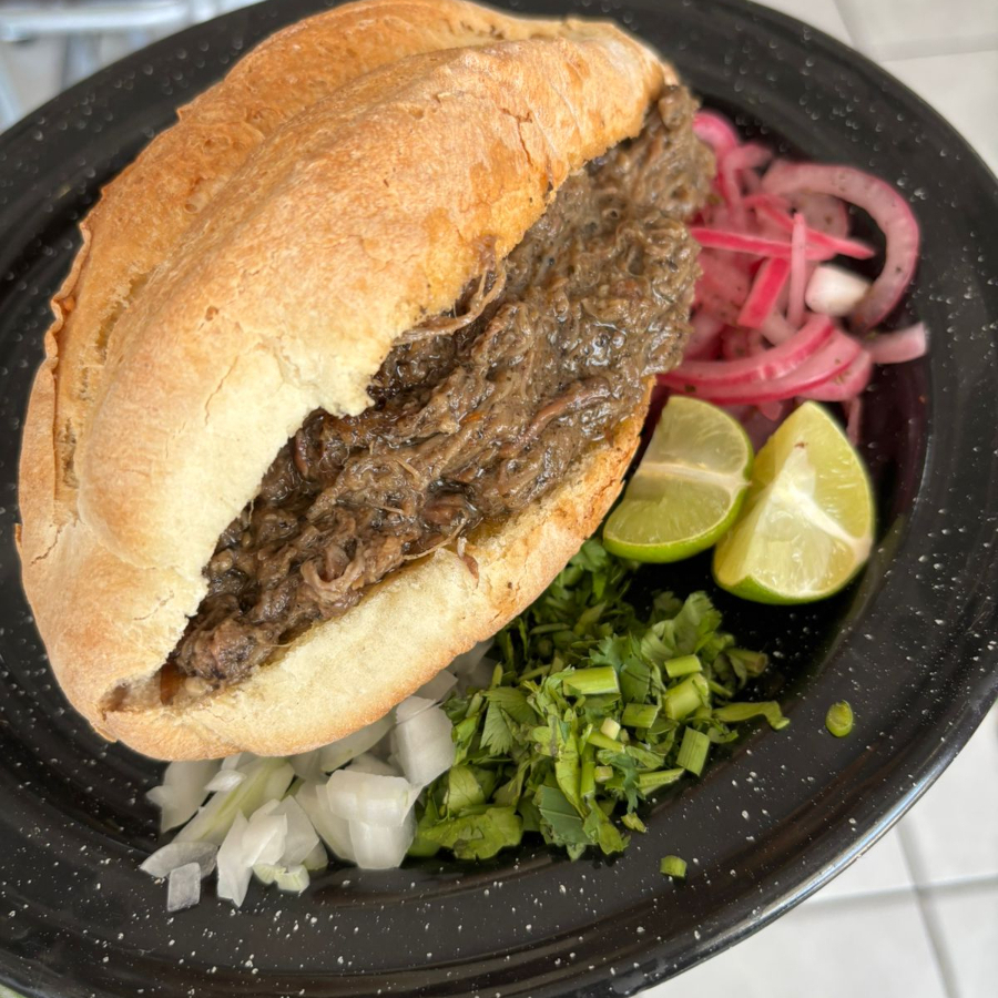 Pan birote del día hecho a la leña, dorado con mantequilla, frijoles maneados, queso gouda, acompañado con carne de tu elección.