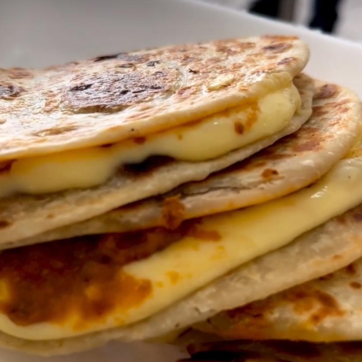 Tortilla de harina taquera, queso gouda, huevo estrellado o revuelto, carne de su elección.