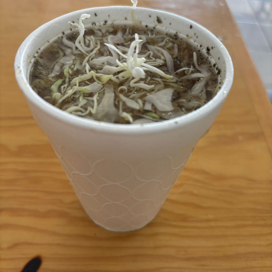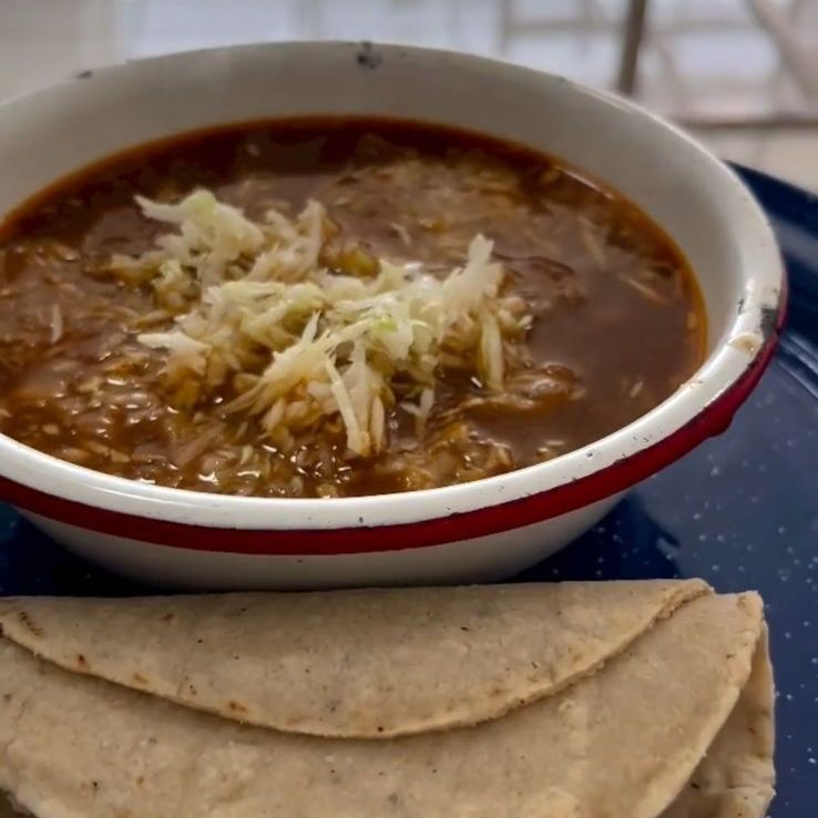 Carne con chile medio litro, tortillas de maíz, salsa tatemada, salsa roja, salsa verde, salsa habanera, limones, repollo, cebolla morada, cebolla blanca, cilantro, chile serrano.