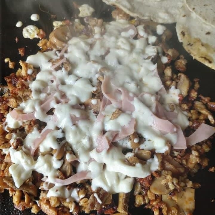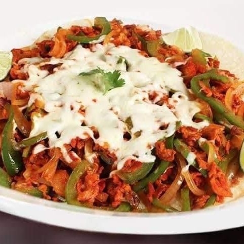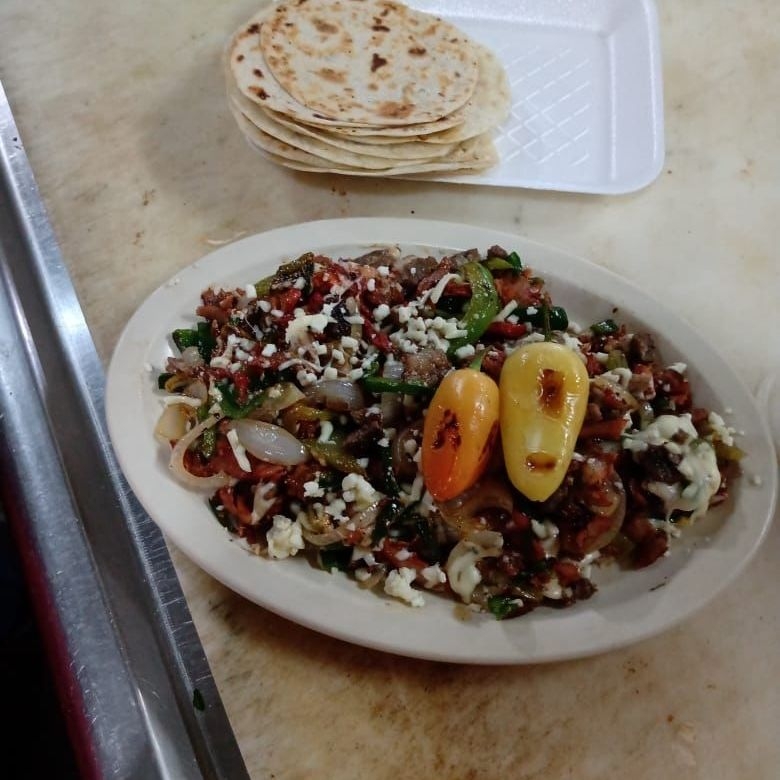 Alambre con pastor, carne asada, morrón, cebolla y queso.