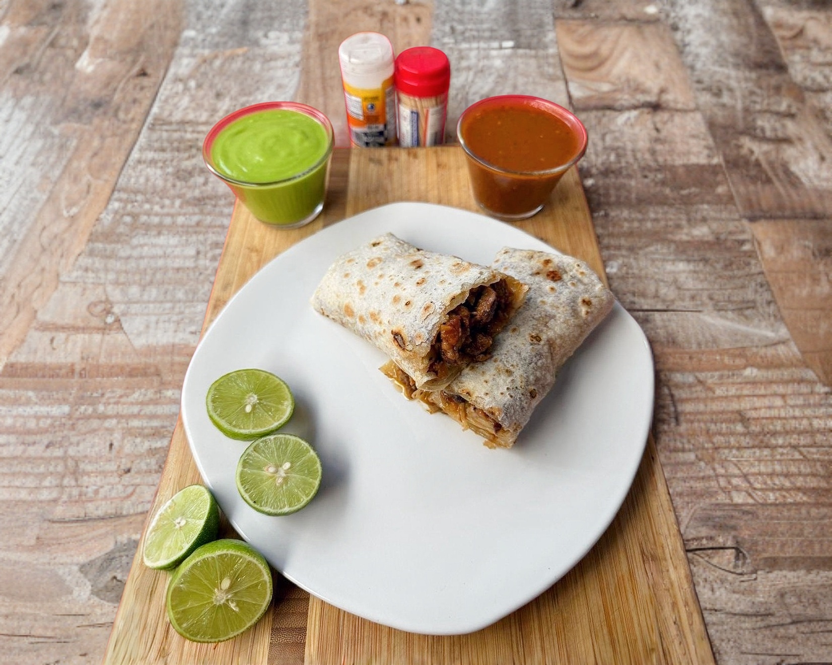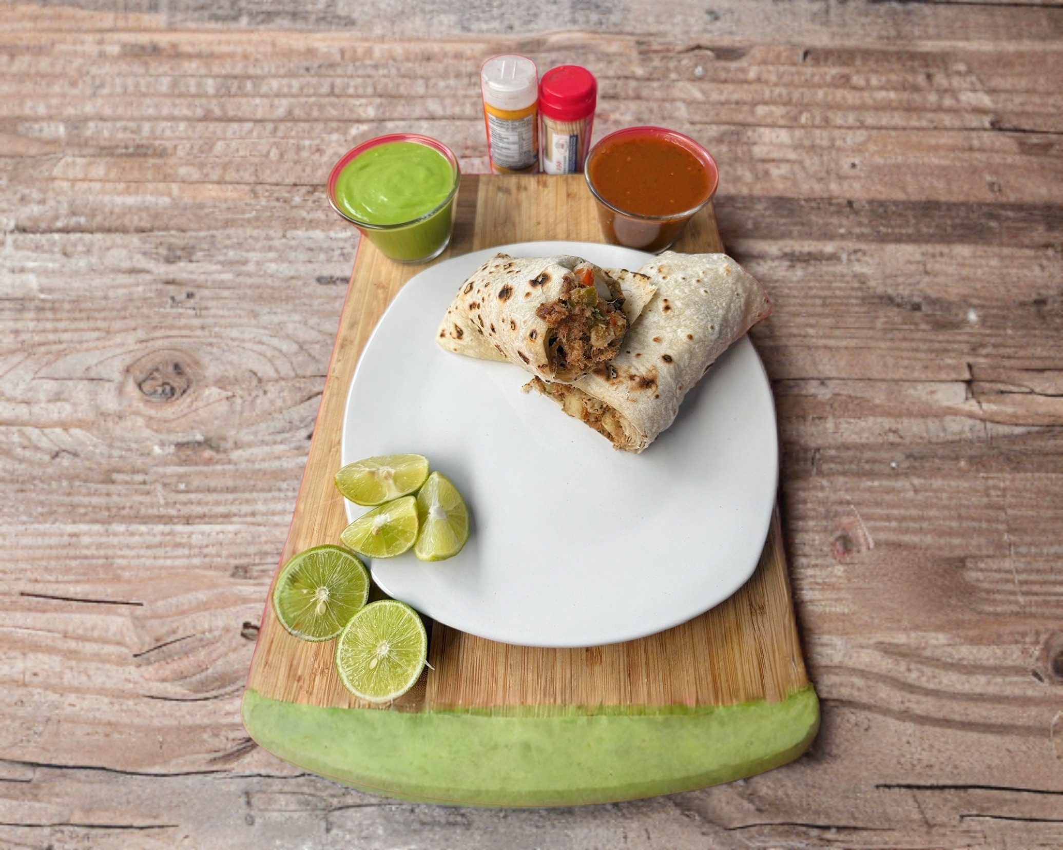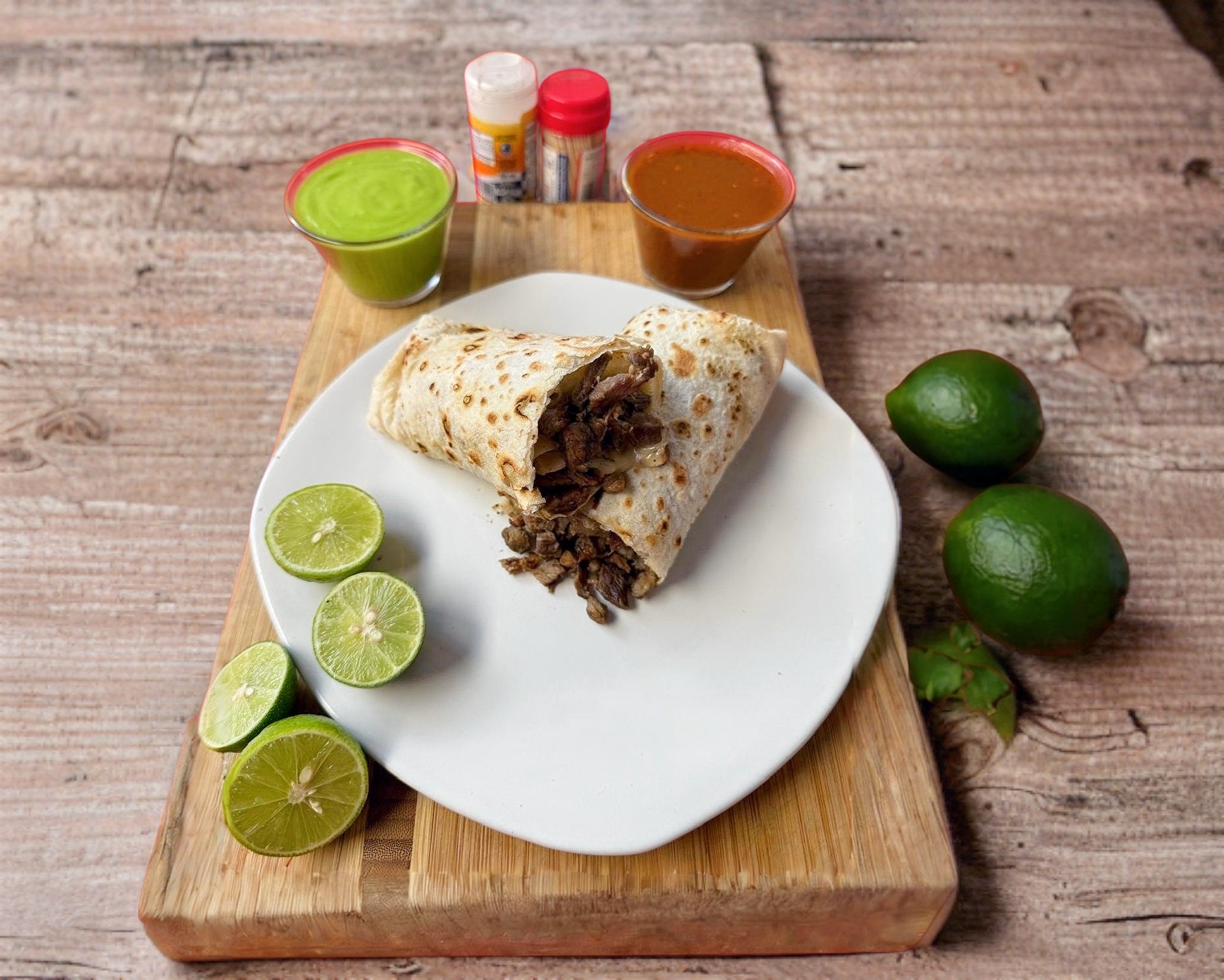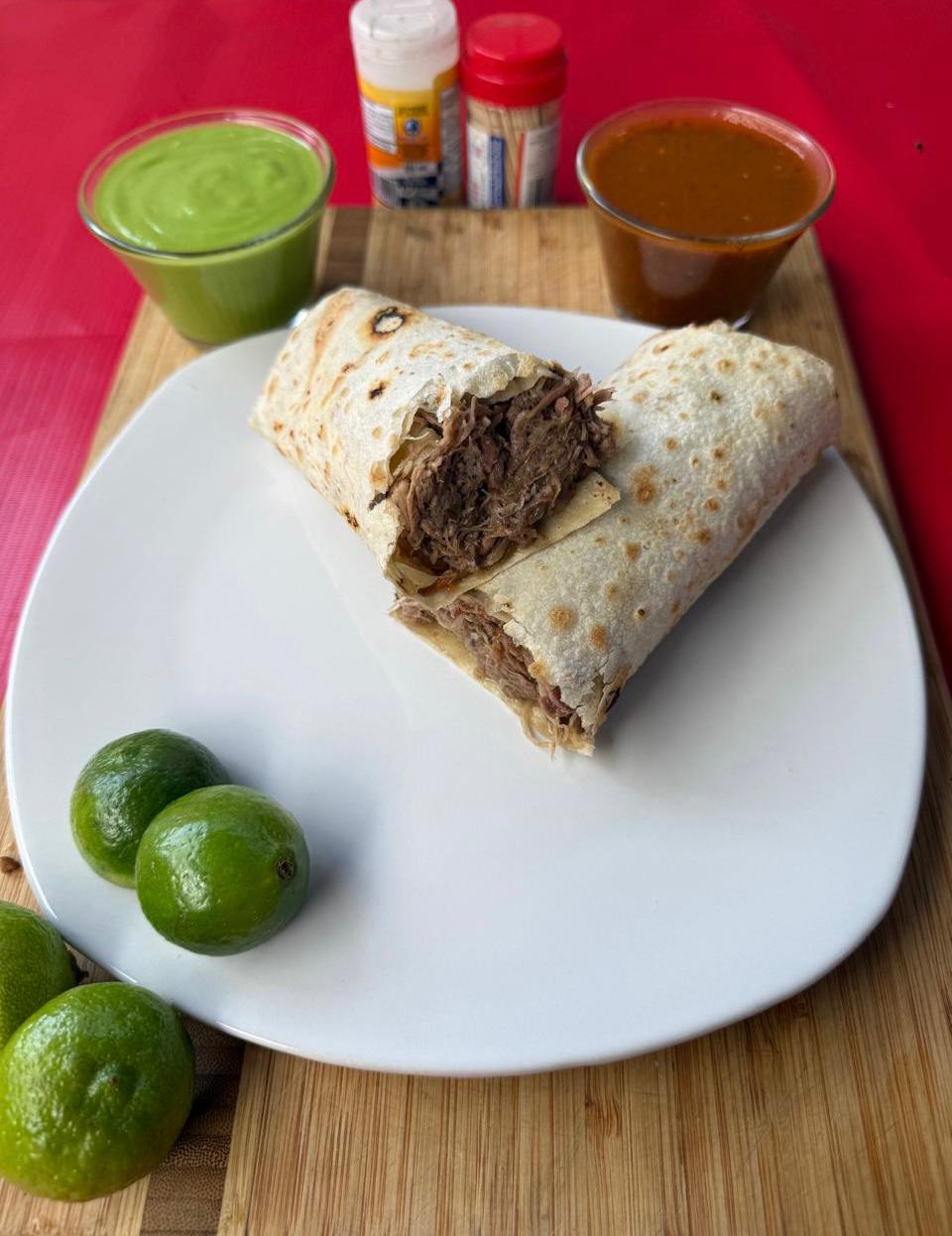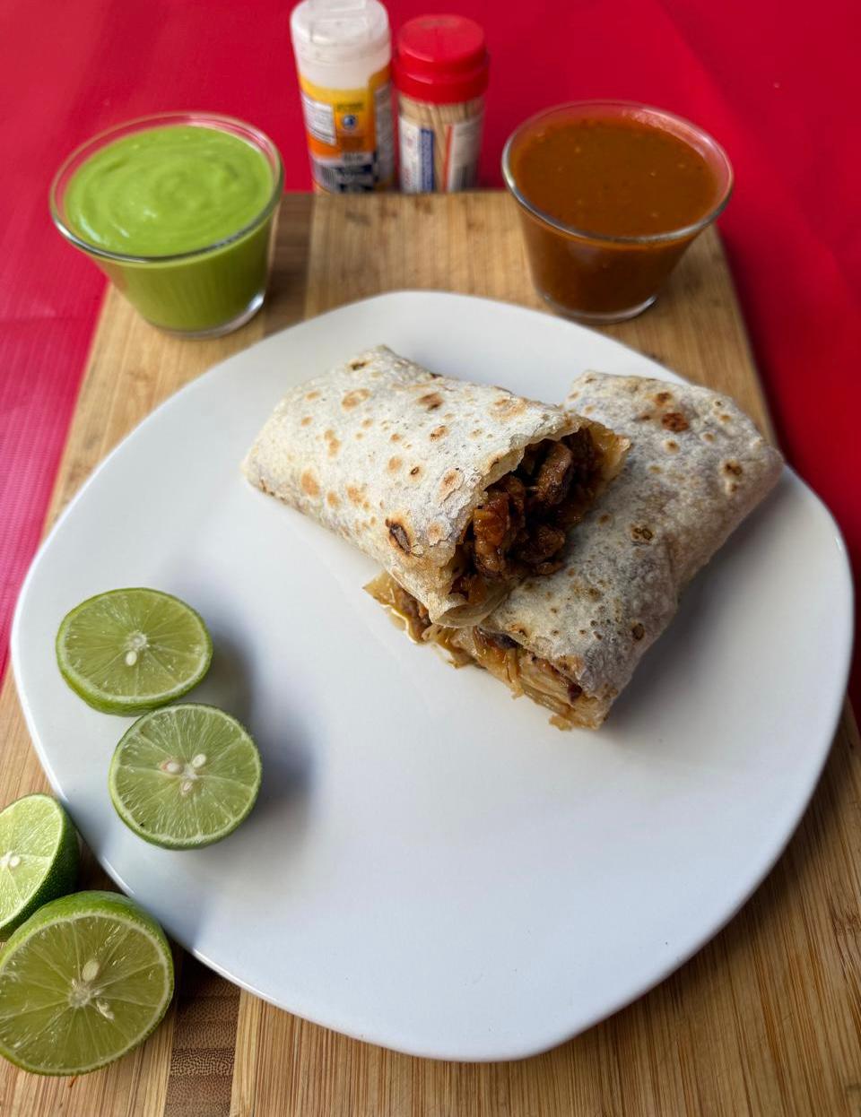 Tortilla de harina grande, burritos a elección del usuario, verduras, limones y salsas.