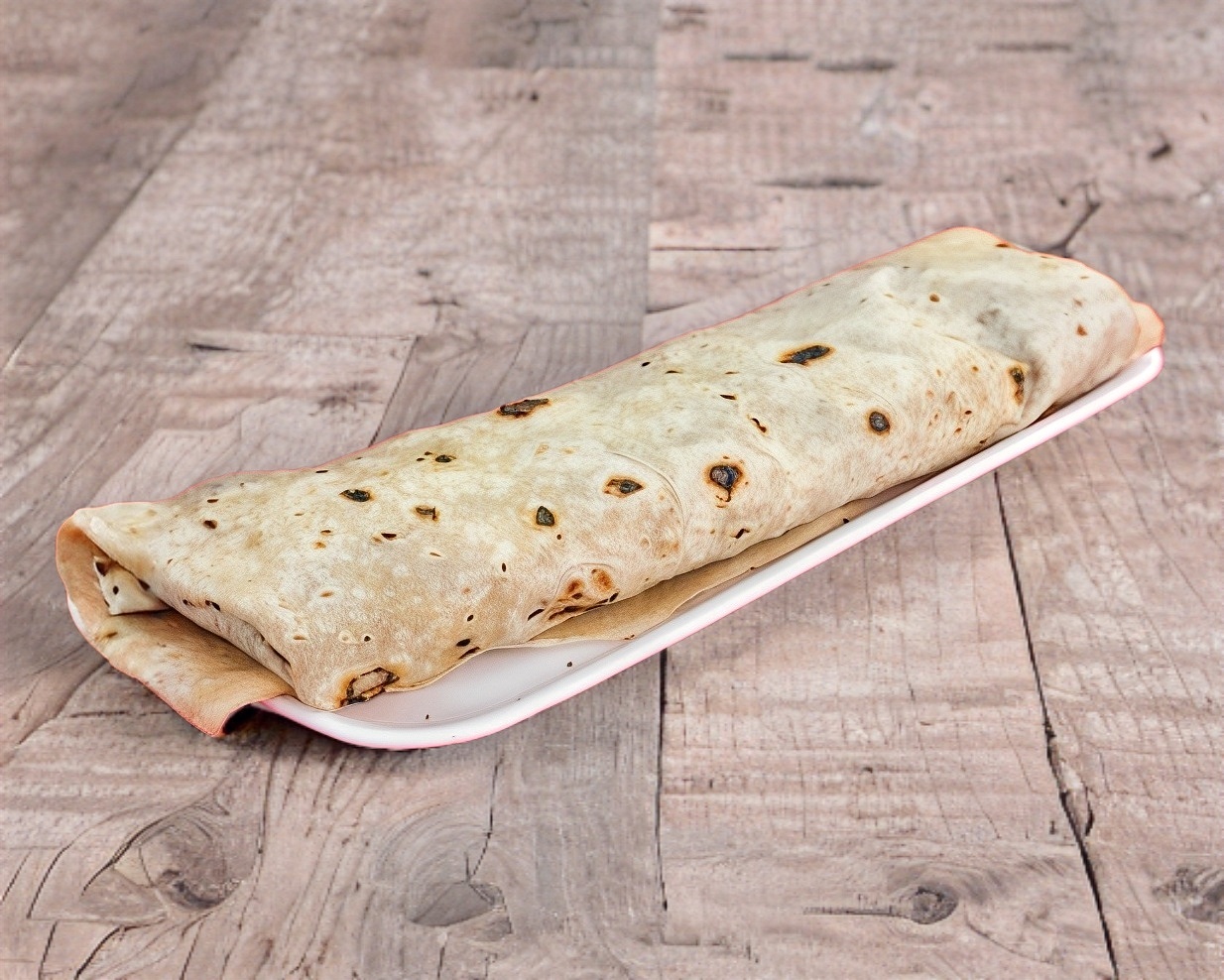 Burro en tortilla de harina relleno de chicharrón.