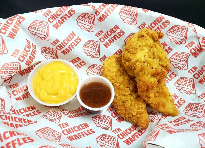 210g de tender de pechuga de pollo horneado, par de waffles recien hechos, doble porcion tocino horneado, doble porcion de queso cheddar (salsa de la casa y miel e complemento)