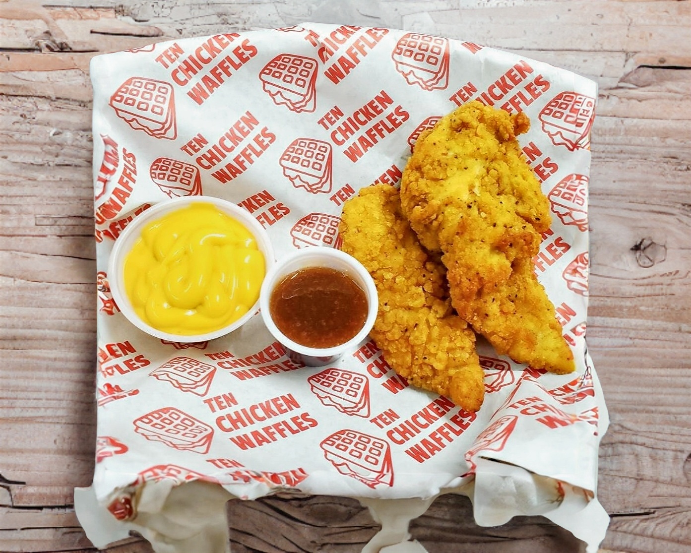 platillo personal que contiene 110g de tender de pechuga de pollo horneados, par de waffles recien hechos, tocino horneado, queso cheddar (salsa de la casa y miel de complemento).