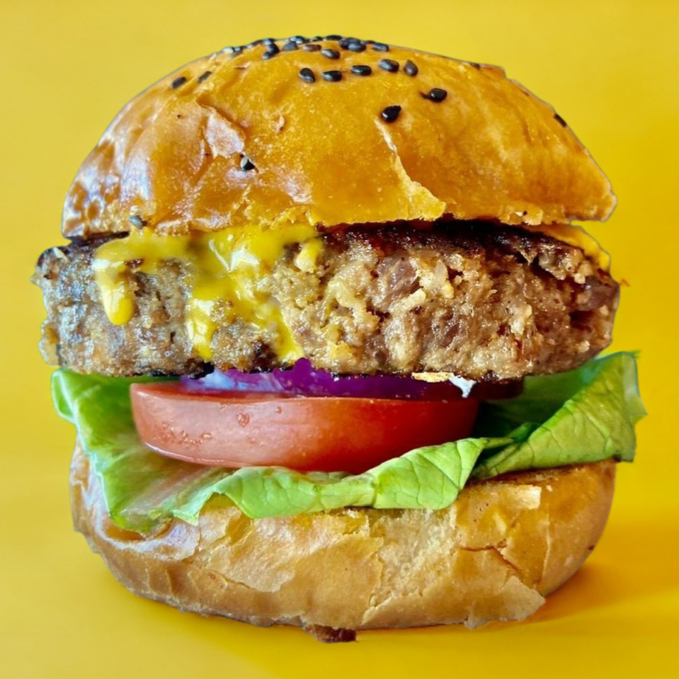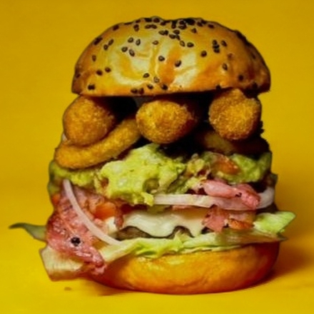 Carne de Res, Queso cheddar, Queso Asadero, Tocino, aguacate, Cebolla y Chile Verde Asado, Lechuga, Tomate y Cebolla. En Pan Brioche Artesanal