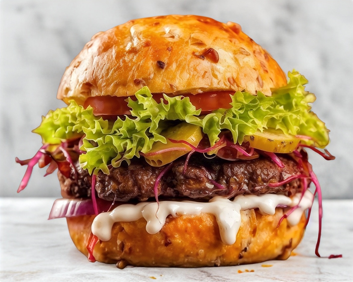 Carne de Res, Queso Cheddar, Lechuga, Tomate y Cebolla. En pan Brioche