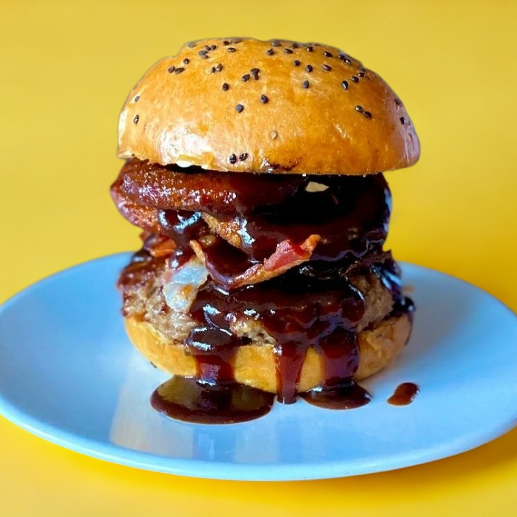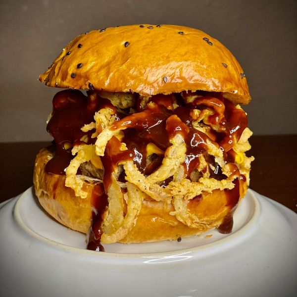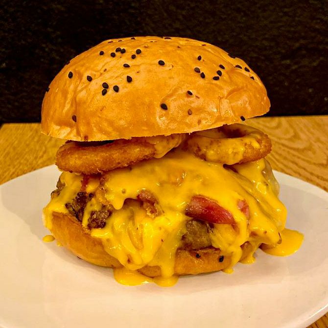 Doble carne de 180gr diezmillo de res, triple tocino, extra aros de cebolla, y extra BBQ.