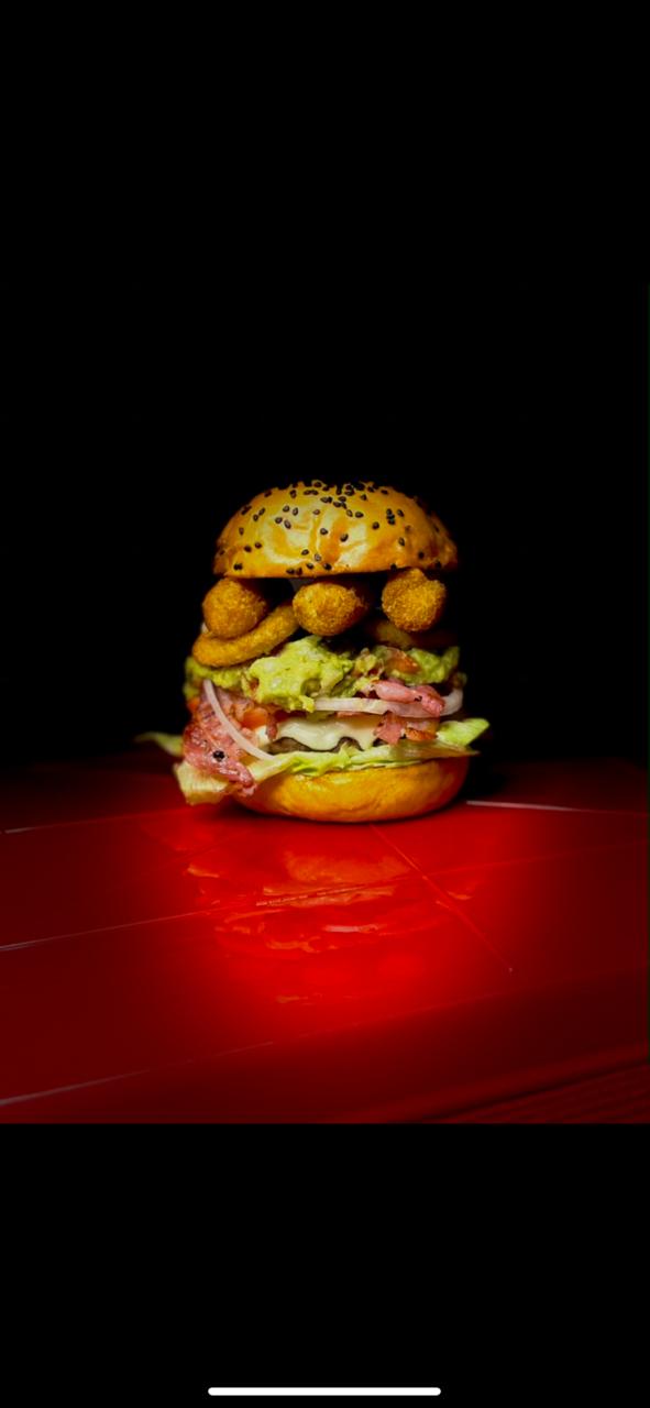 180gr de diezmillo de res, tocino, queso, queso asadero, guacamole, aros de cebolla, dedos de queso y verdura.