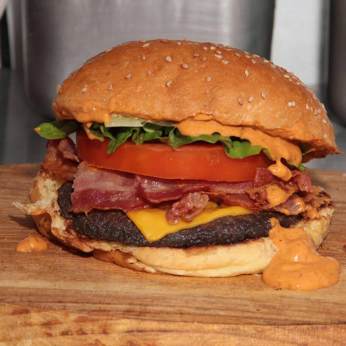 Carne de res, queso Chihuahua, queso americano,tocino, lechuga, cebolla, tomate, aderezo ranch-chipotle, y papas.