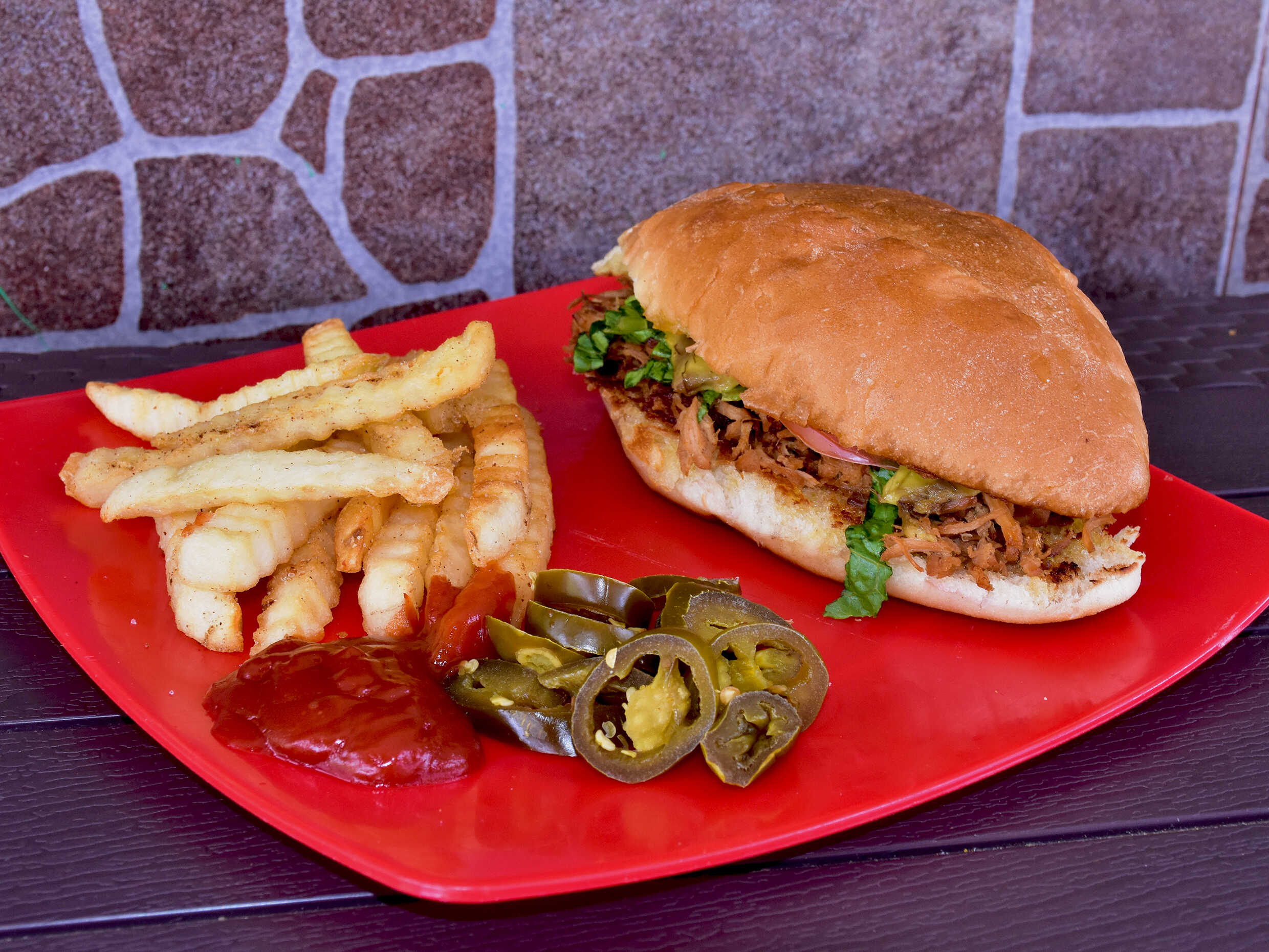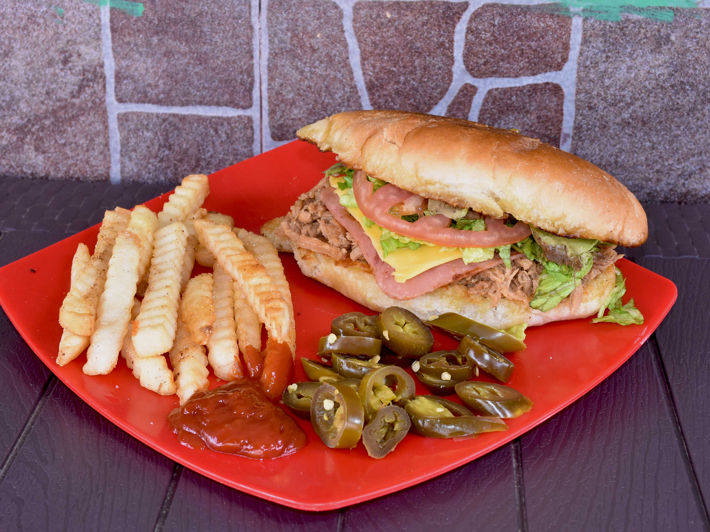 Deliciosa carne de pierna preparada lechuga, tomate, aguacate, cebolla morada, mayonesa y mostaza , acompañada con chiles jalapeños en escabeche.