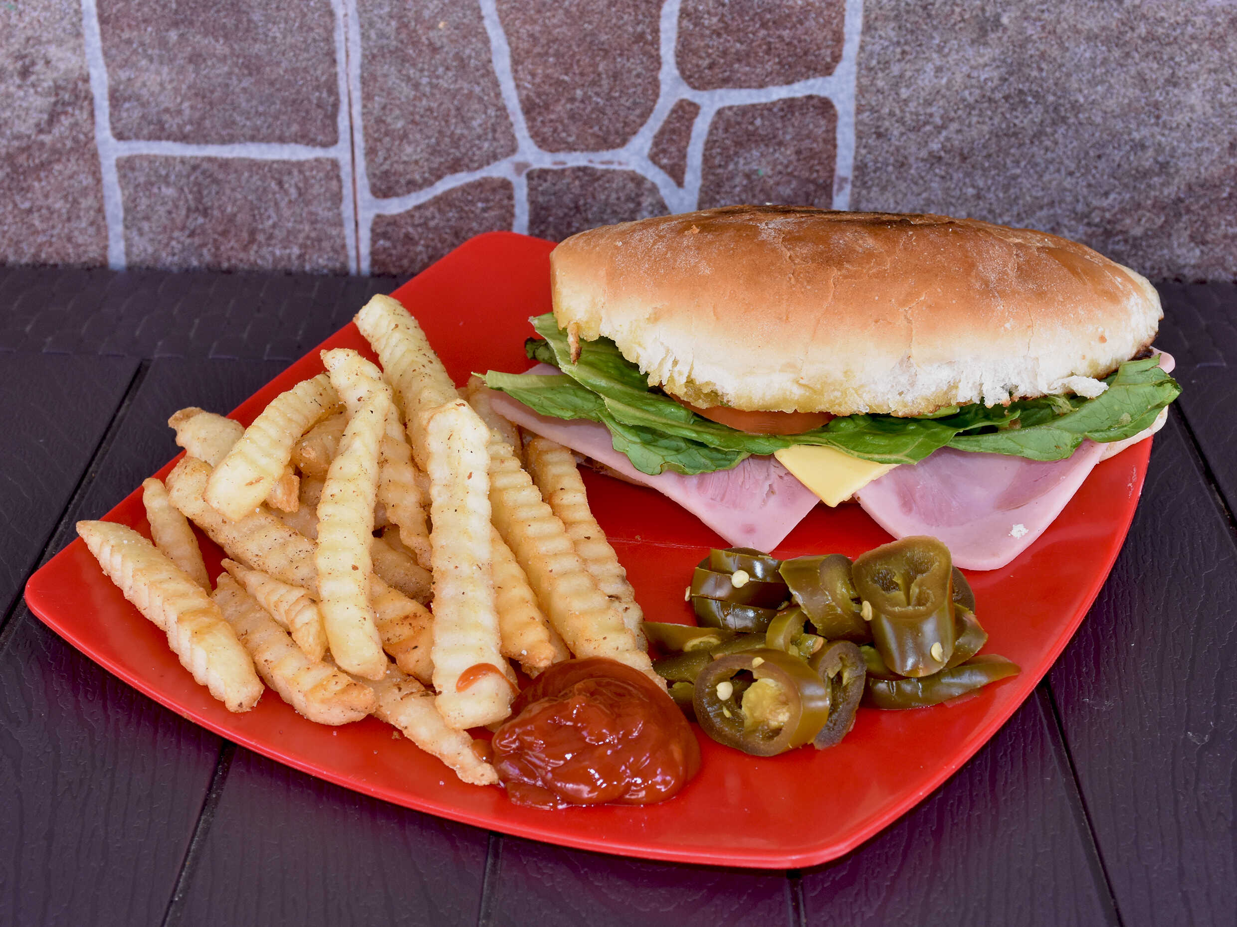 Jamón de pavo , lechuga , tomate y queso americano , acompañada de un chile serrano.