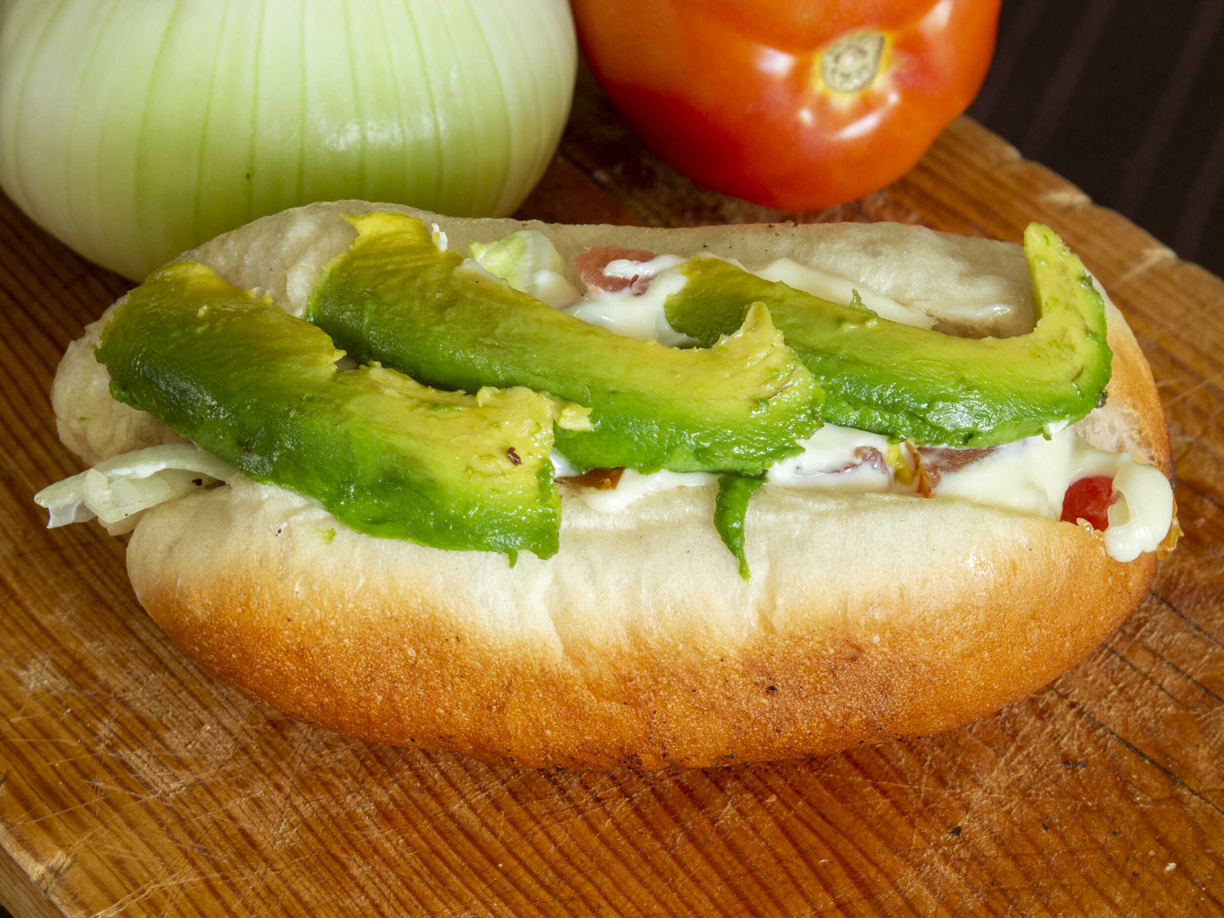 MAYONESA, SALCHICHA C/TOCINO, TOMATE,CEBOLLA Y GUACAMOLE.