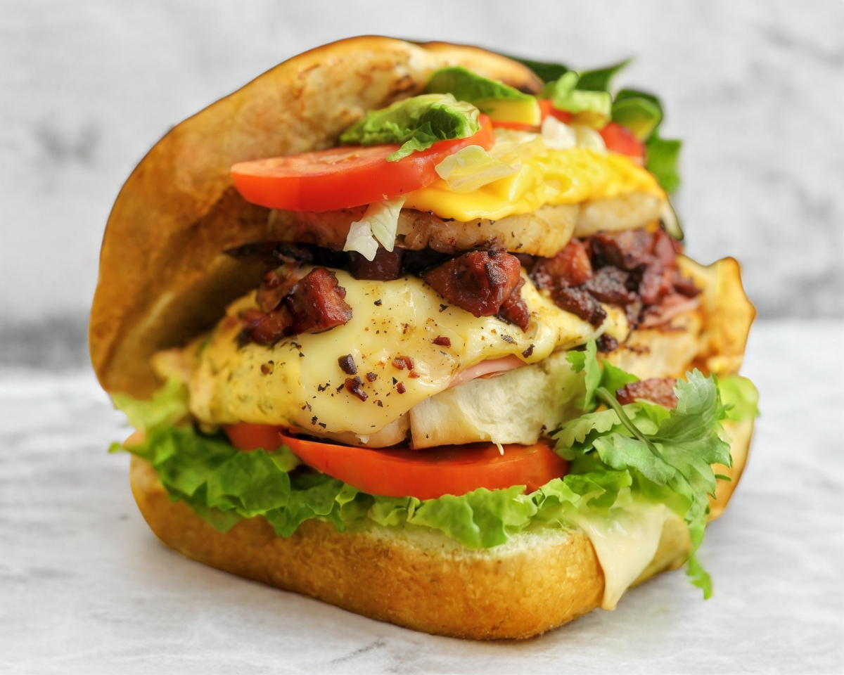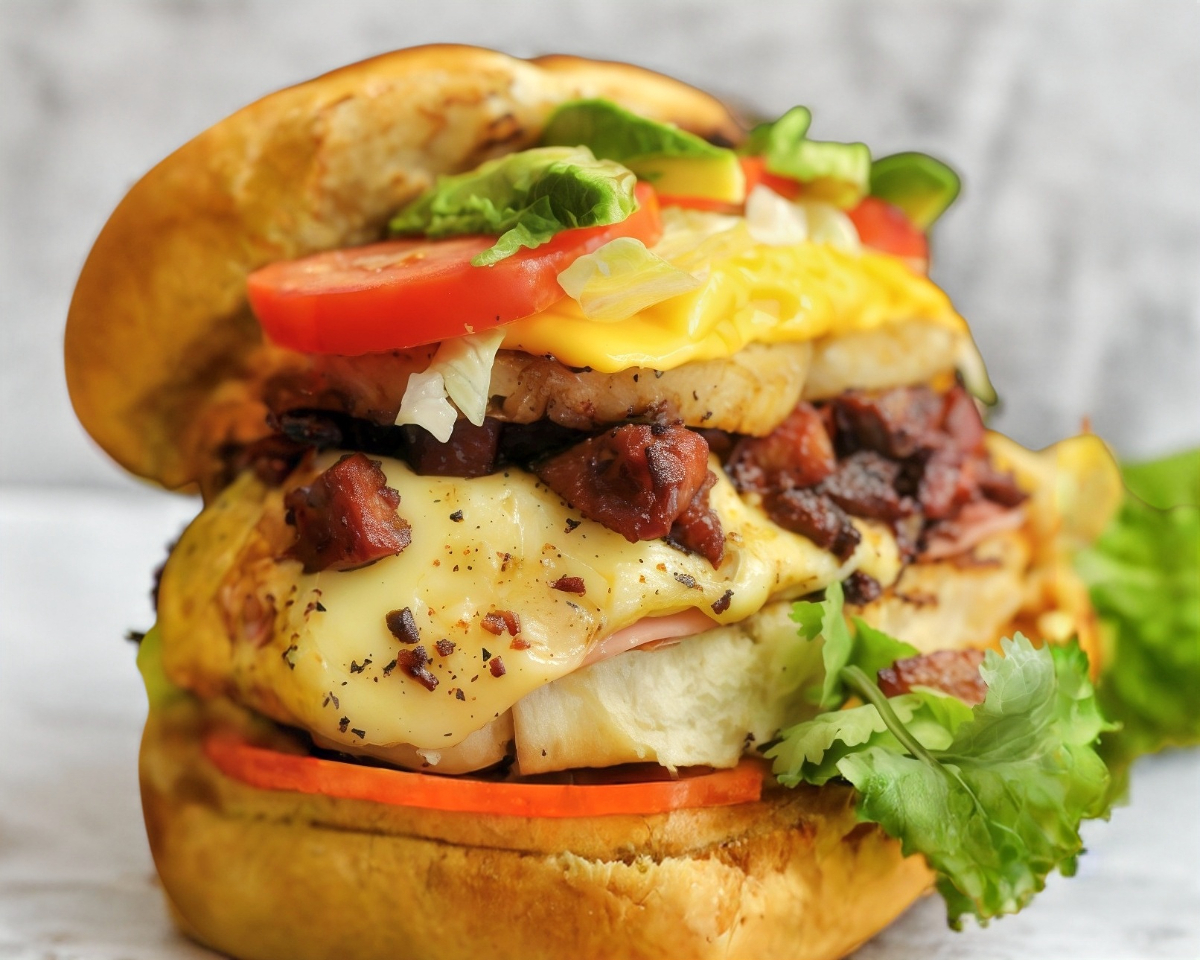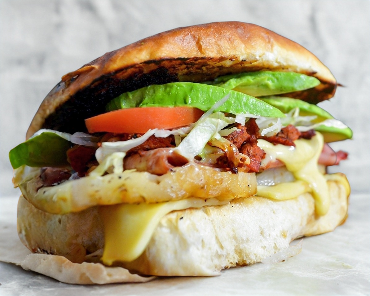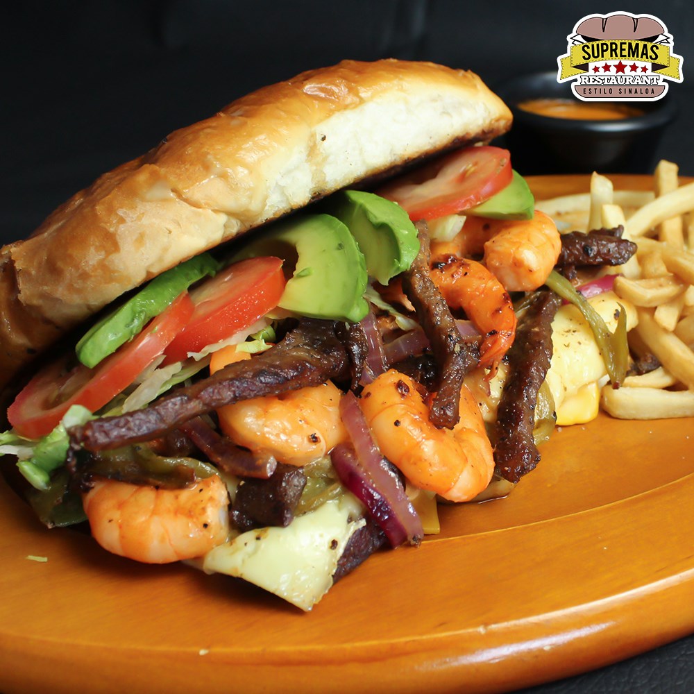 Pan telera, pierna horneada de cerdo 140 gramos, doble porción de jamón de pavo, tiras de pechuga de pollo empanizado, queso chihuahua y americano gratinado.