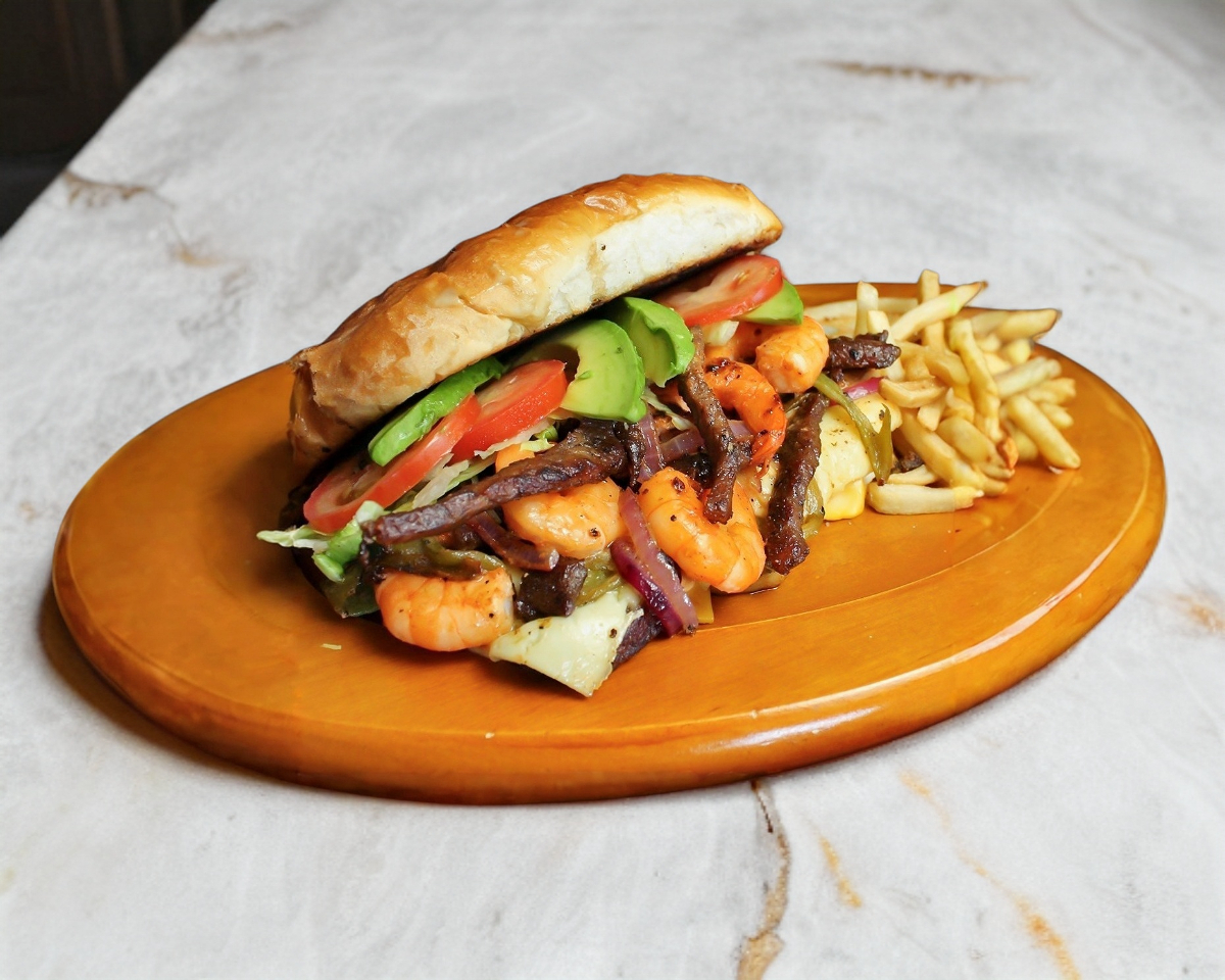 Camarón en mantequilla salteados con chile verde frito cebolla caramelizada, carne de res a la plancha y queso fundido.