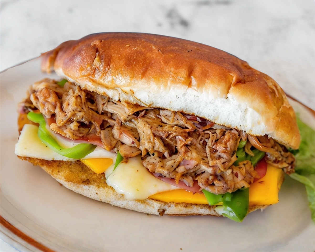 Pierna horneada, doble porción de jamón de pavo, chile verde frito, queso Chihuahua y americano. Ideal para una persona.