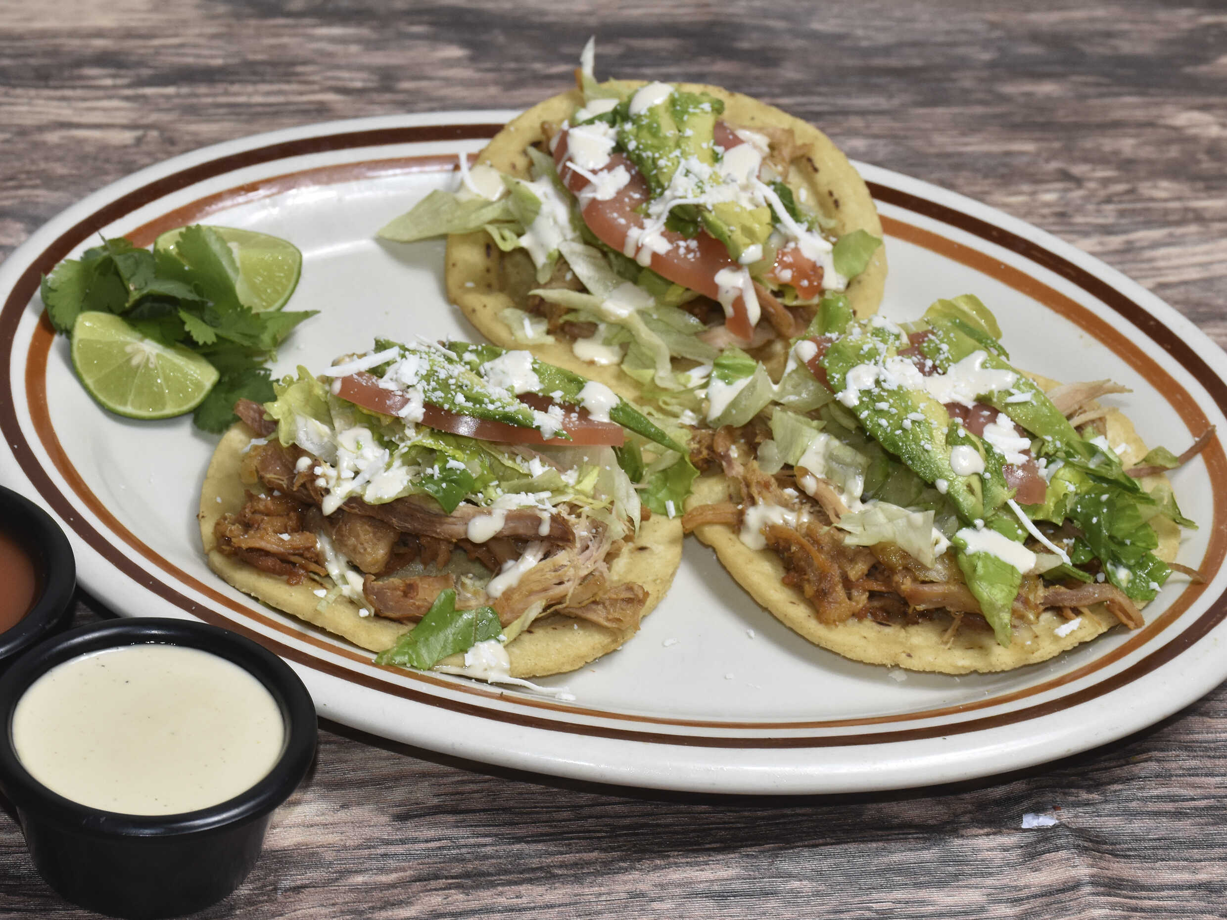 Gorditas de maíz con cochinita pibil horneada o pierna a su elección con lechuga, tomate, aguacate, aderezo, crema y queso en polvo (3 piezas).