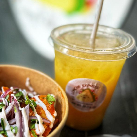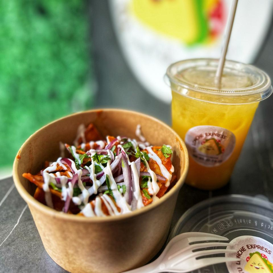 Tortilla de maíz frita bañada en salsa de tomatillo junto con una mezcla de quesos acompañados de frijoles puercos, cebolla y cilantro.