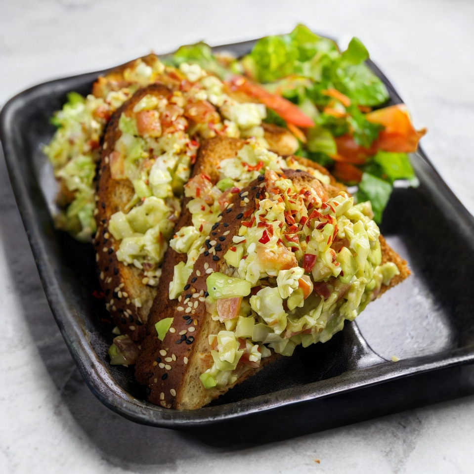 2 Rebanadas de pan con aguacate, 50 gr de queso panela bajo en grasa, tomate y cebolla picada, espolvoreados con chile quebrado.