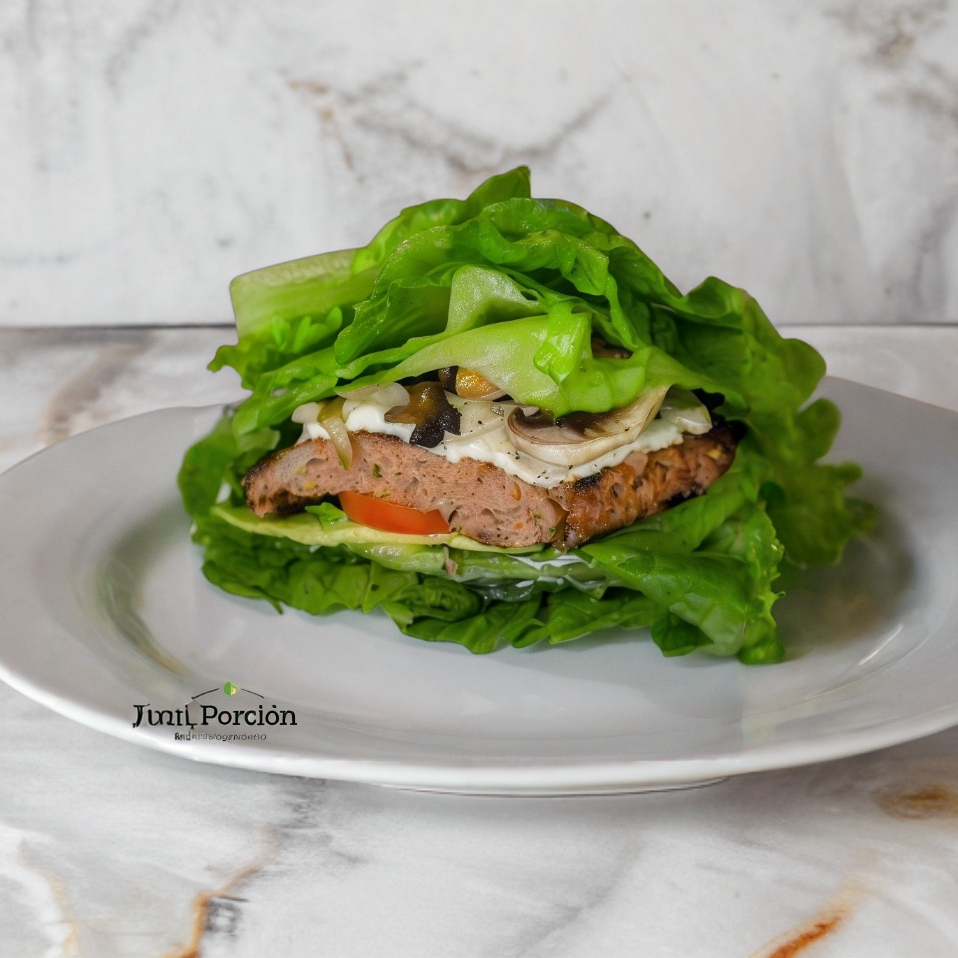 Lechuga como tapas, 140gr de carne para hamburguesa, queso panela, champiñón y cebolla asados, aguacate, mayonesa y mostaza.